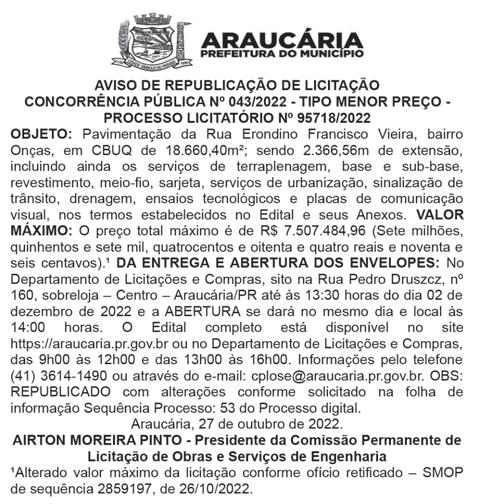 O Departamento de Es tradas de Rodagem do Pa raná (DER/PR) publicou o resultado da análise de propostas de preços da li citação para reformar nove obras de arte especiais (OAEs), neste caso pon tes e viadutos, na Região Metropolitana de Curitiba (RMC). Três participantes foram classificadas e terão seus envelopes com do cumentos de habilitação abertos em 3 de novembro, às 16h, no auditório do DER em Curitiba.