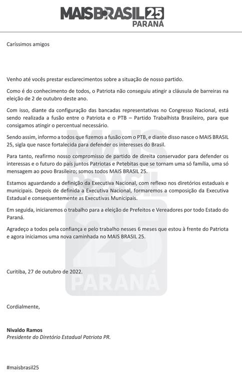 O líder do presidente Jair Bolsonaro (PL) na Câma ra Federal, o deputado paranaense Ricardo Barros (PP) disse par a militantes do Progressistas que as conversas para criação de uma federação partidá ria com o União Brasil estão suspensas e dificil mente irá ocorrer, a única chance é um fato novo, nos próximos meses, o que parece improvável.