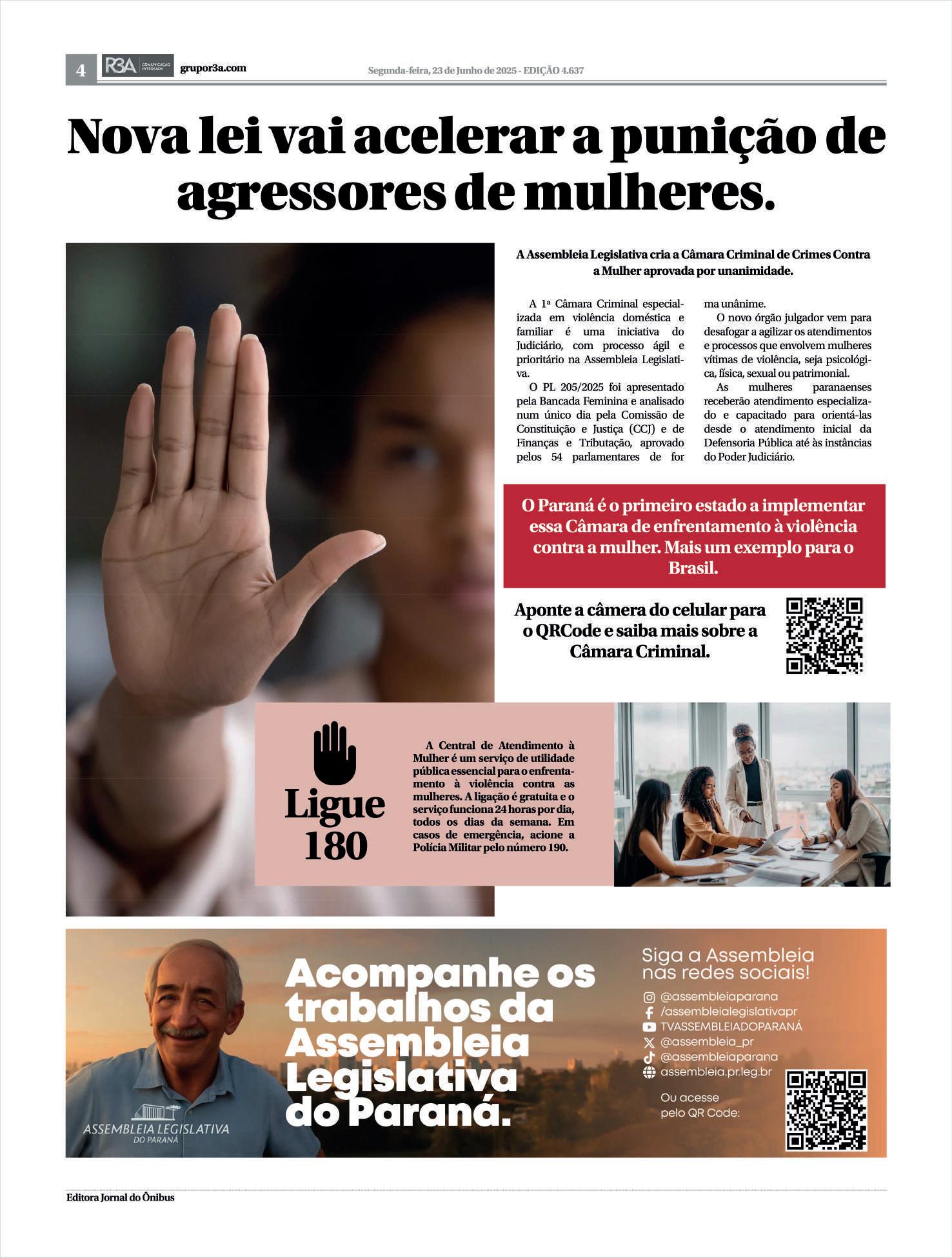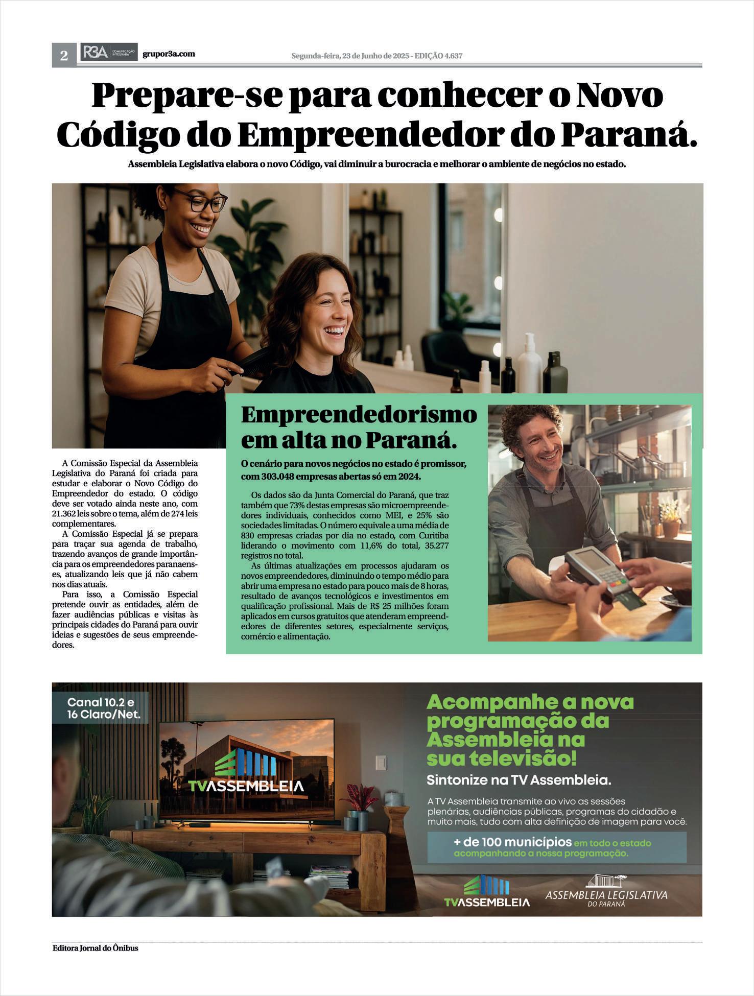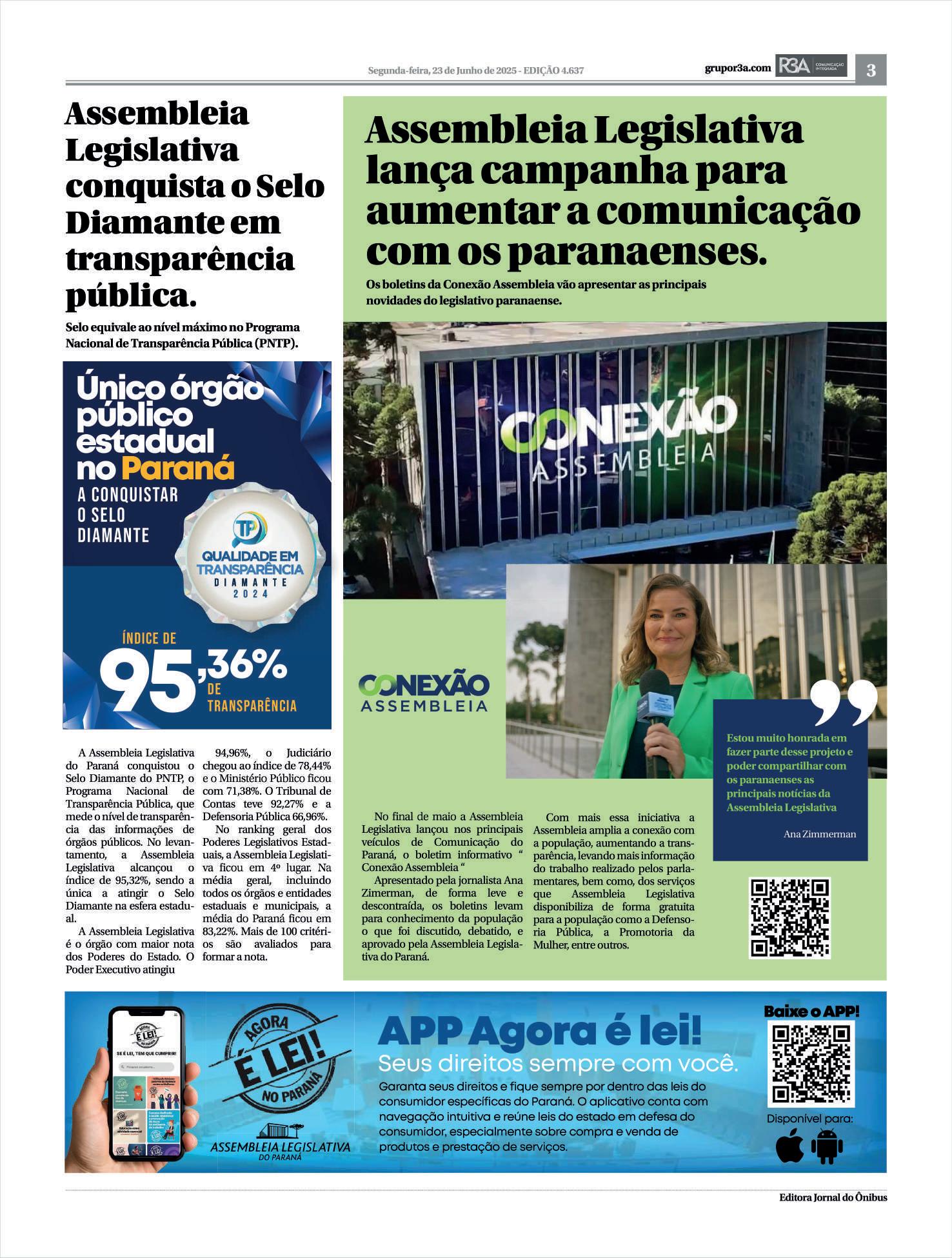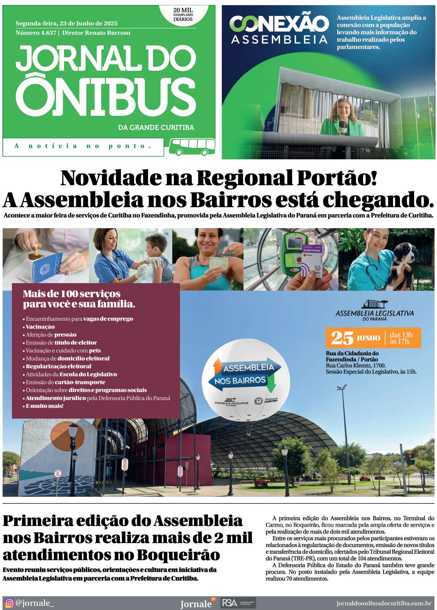 A Câmara Municipal de Curitiba discute autorizações para que a Prefeitura possa contratar operações de crédito de pouco mais de R$ 1 bilhão. A justificativa dos financiamentos são a ampliação da frota de ônibus elétricos e a geração de energia solar. (Página 5)