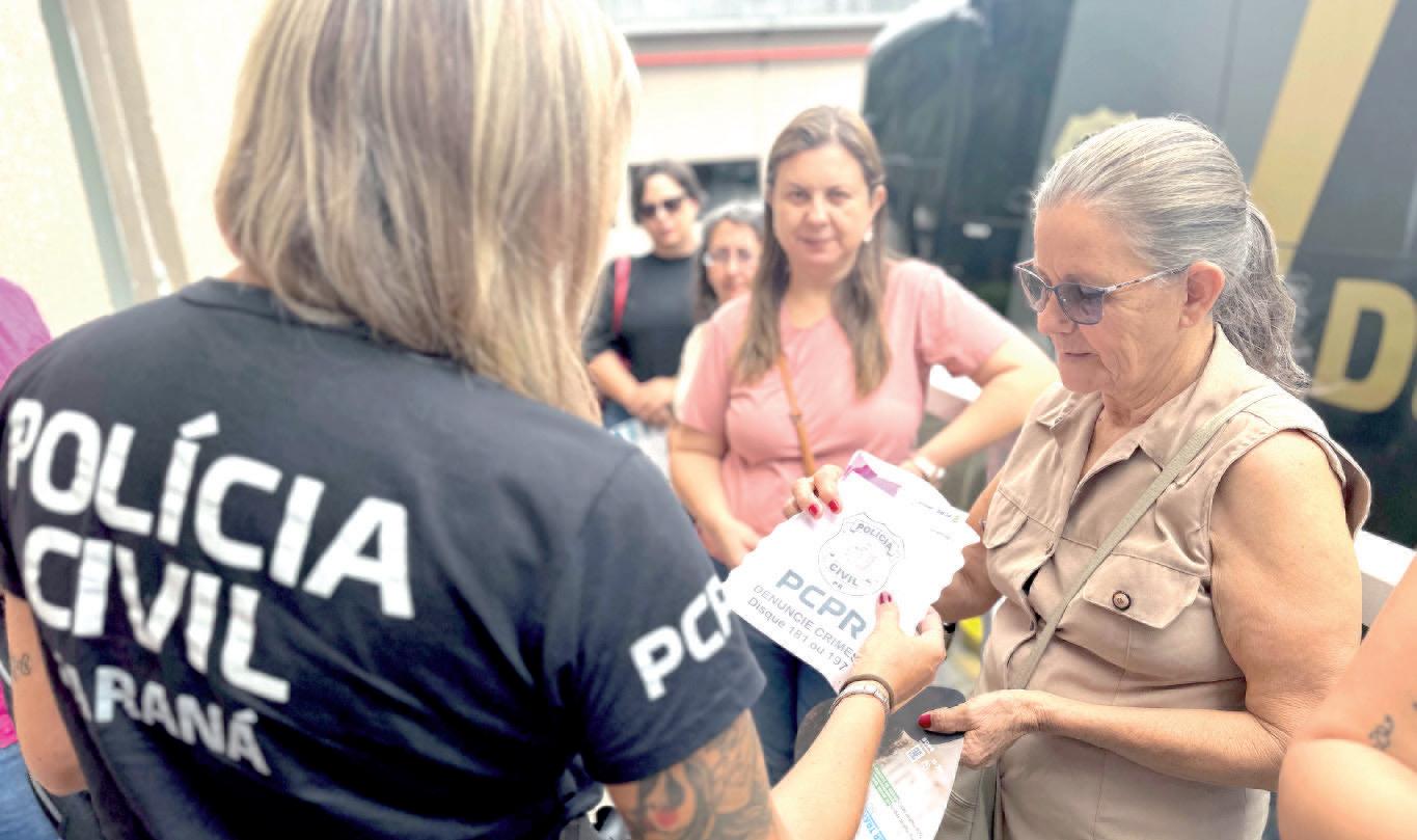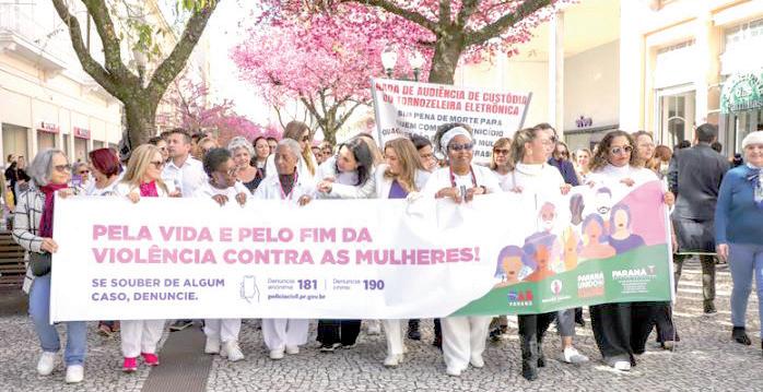 ordem acompanharam o cortejo silencioso, que também contou com a distribuição de materiais informativos sobre como identificar, denunciar e buscar apoio em casos de violência doméstica, psicológica e patrimonial. n