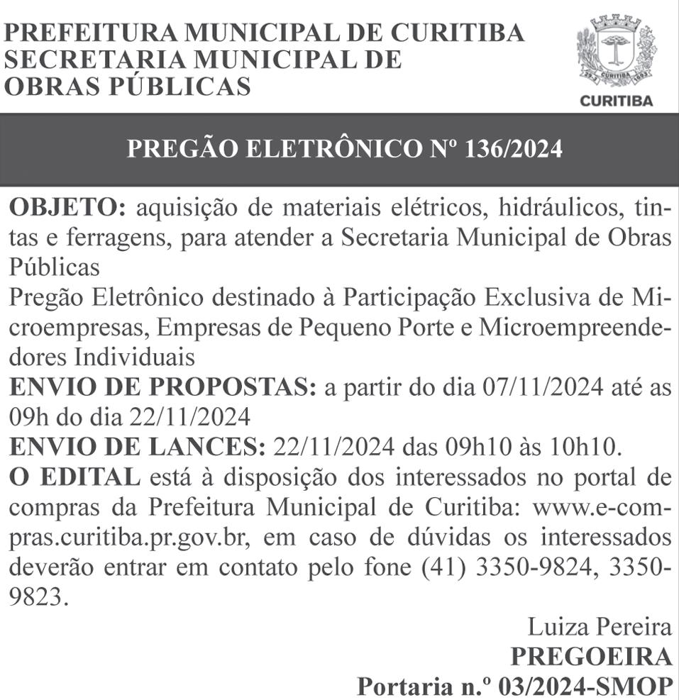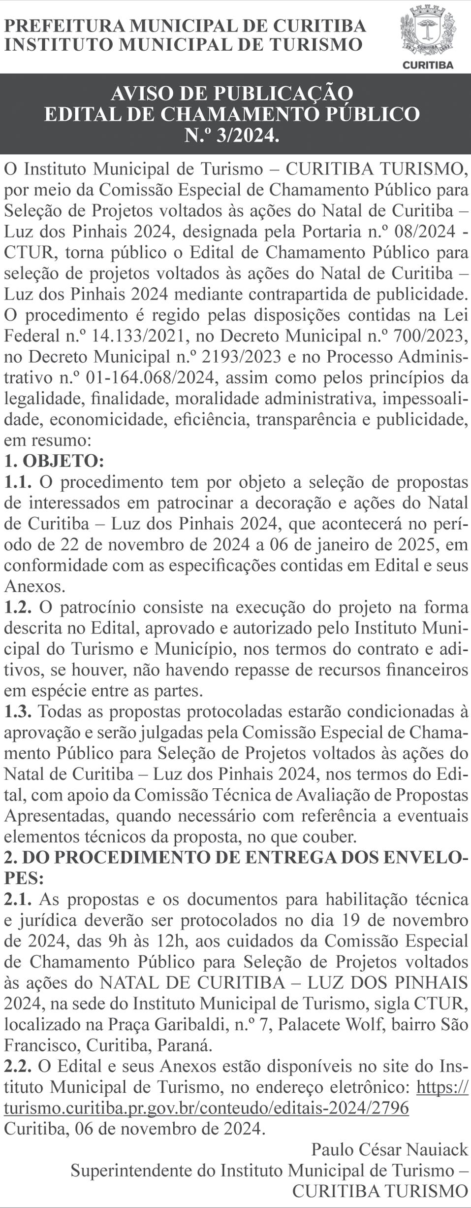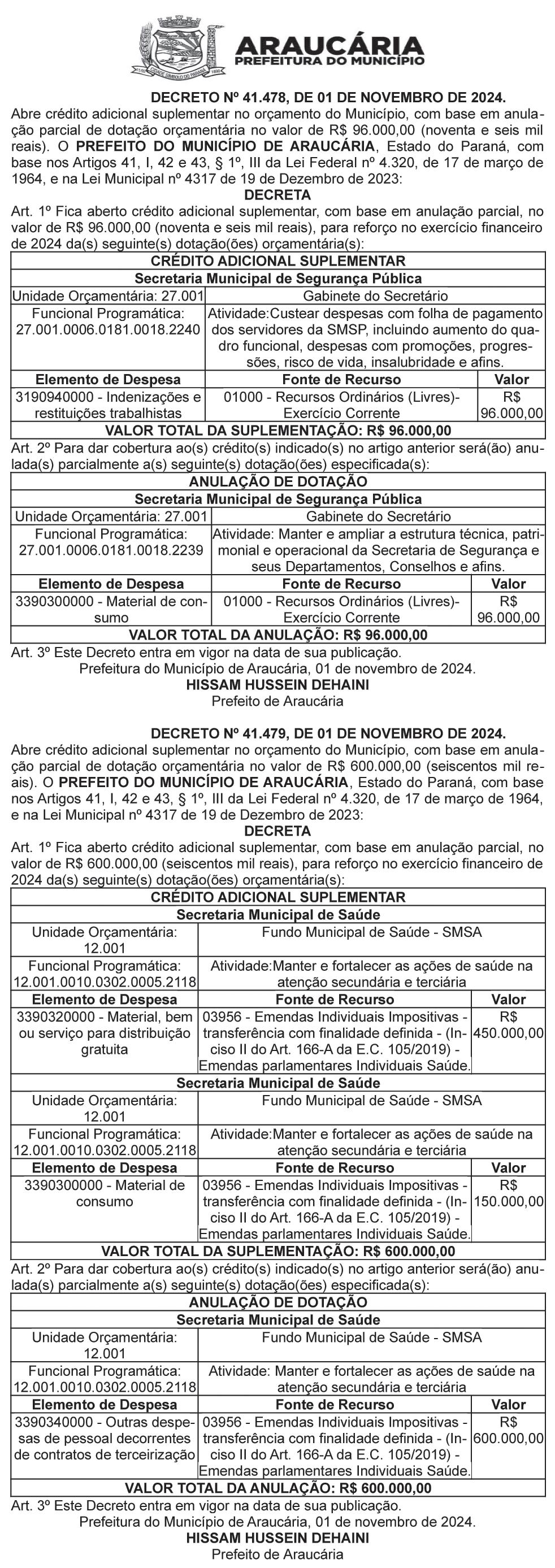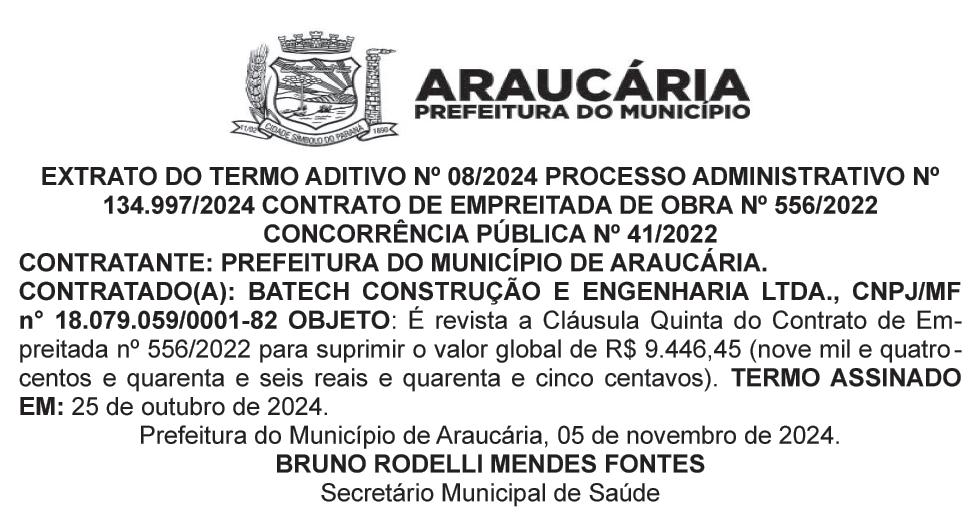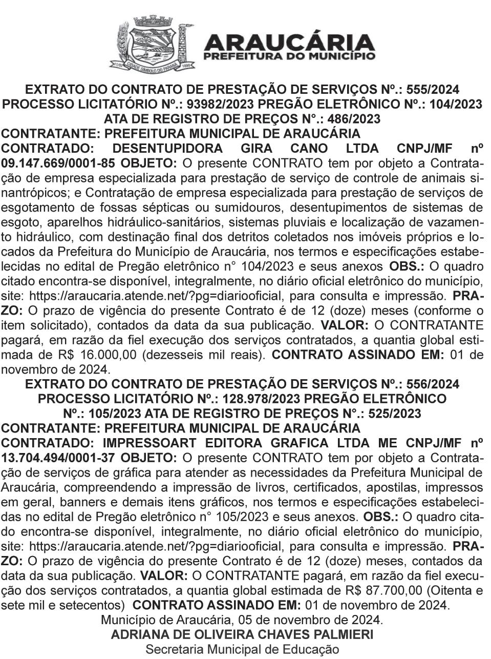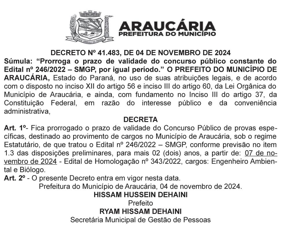 A Prefeitura de Araucária divulgou ontem no Diário Oficial do Município três editais de concurso público que contemplam 44 cargos, do nível fundamental ao nível superior. Considerando o histórico, trata-se da maior quantidade de cargos listados em um único concurso. A inscrição será das 8 horas de 11 de novembro às 23h59 de 11 de dezembro por meio do site www. fundacaofafipa.org. br. A data prevista das provas é 26 de janeiro de 2025.