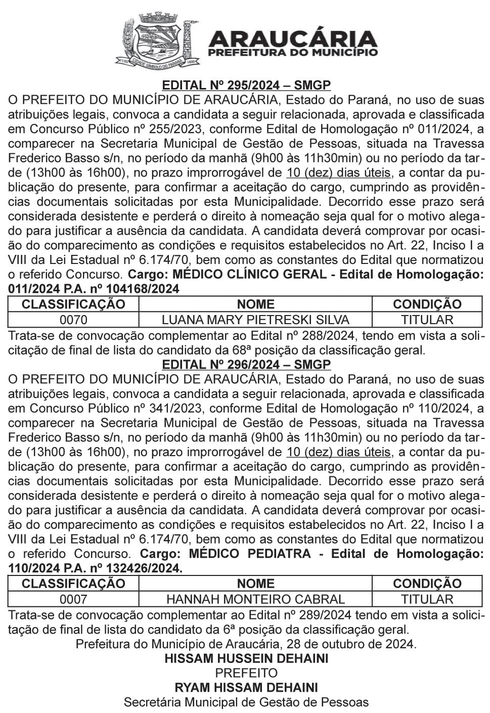 Cada um dos editais apresenta os detalhes sobre os cargos, incluindo requisitos, salários e valor da inscrição. Conforme previsto nos editais, não serão fornecidas informações relacionadas ao concurso via telefone, e-mail ou outros meios. Cabe ao candidato(a) a responsabilidade de ler atentamente ao edital e acompanhar as publicações no site da instituição responsável pela aplicação das provas: www. fundacaofafipa.org. br ou via Diário Oficial do Município. n