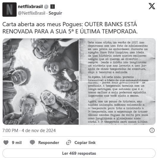 Uma das séries mais populares da Netflix, Outer Banks deve receber novas aventuras em 2025 – mas, ao mesmo tempo, vai chegar a seu fim. Na última segunda-feira (4), o streaming confirmou que a produção foi renovada para uma quinta temporada que vai mostrar o fim das caçadas a tesouros feitas pelos Pogues.