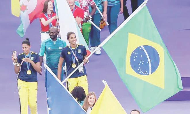 Duda e Ana Patrícia carregam a bandeira no encerramento