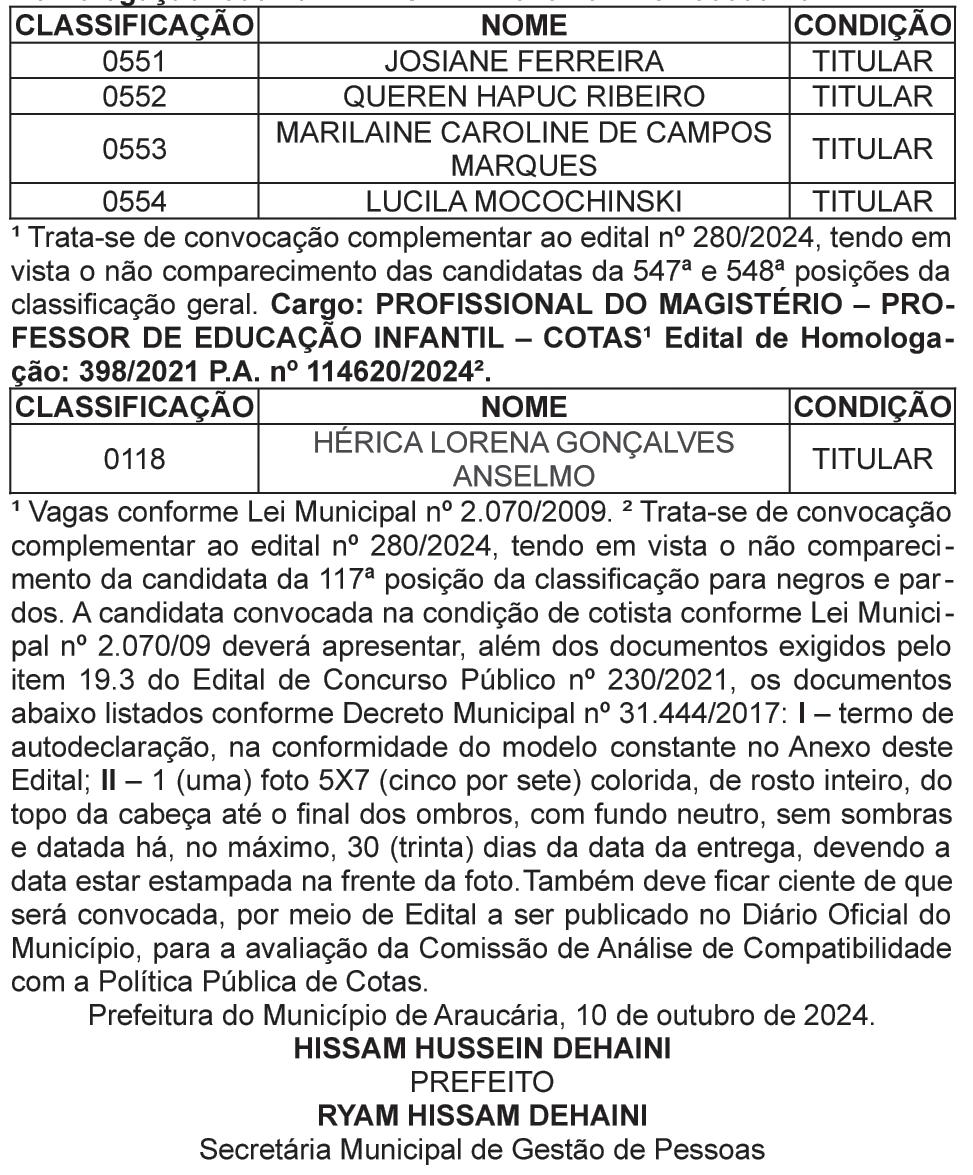 A Prefeitura de Araucária, por meio da Secretaria de Gestão de Pessoas (SMGP), realizou, na última quarta-feira (9), a solenidade de posse de 11 novos médicos aprovados em concurso público, de diferentes especialidades. Somente em 2024, a Prefeitura nomeou 64 profissionais médicos, de diferentes especialidades, aprovados em concurso público. Há previsão de novas posses ainda neste ano. Segundo a Secretaria Municipal de Saúde (SMSA), esses profissionais serão encaminhados da seguinte forma: 01 médico ginecologista-obstetra para a USF Shangri-lá e