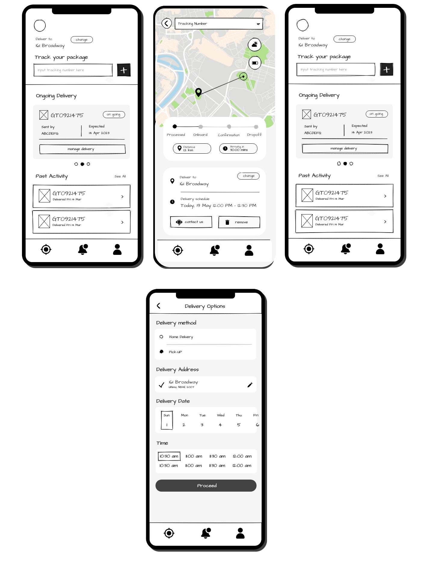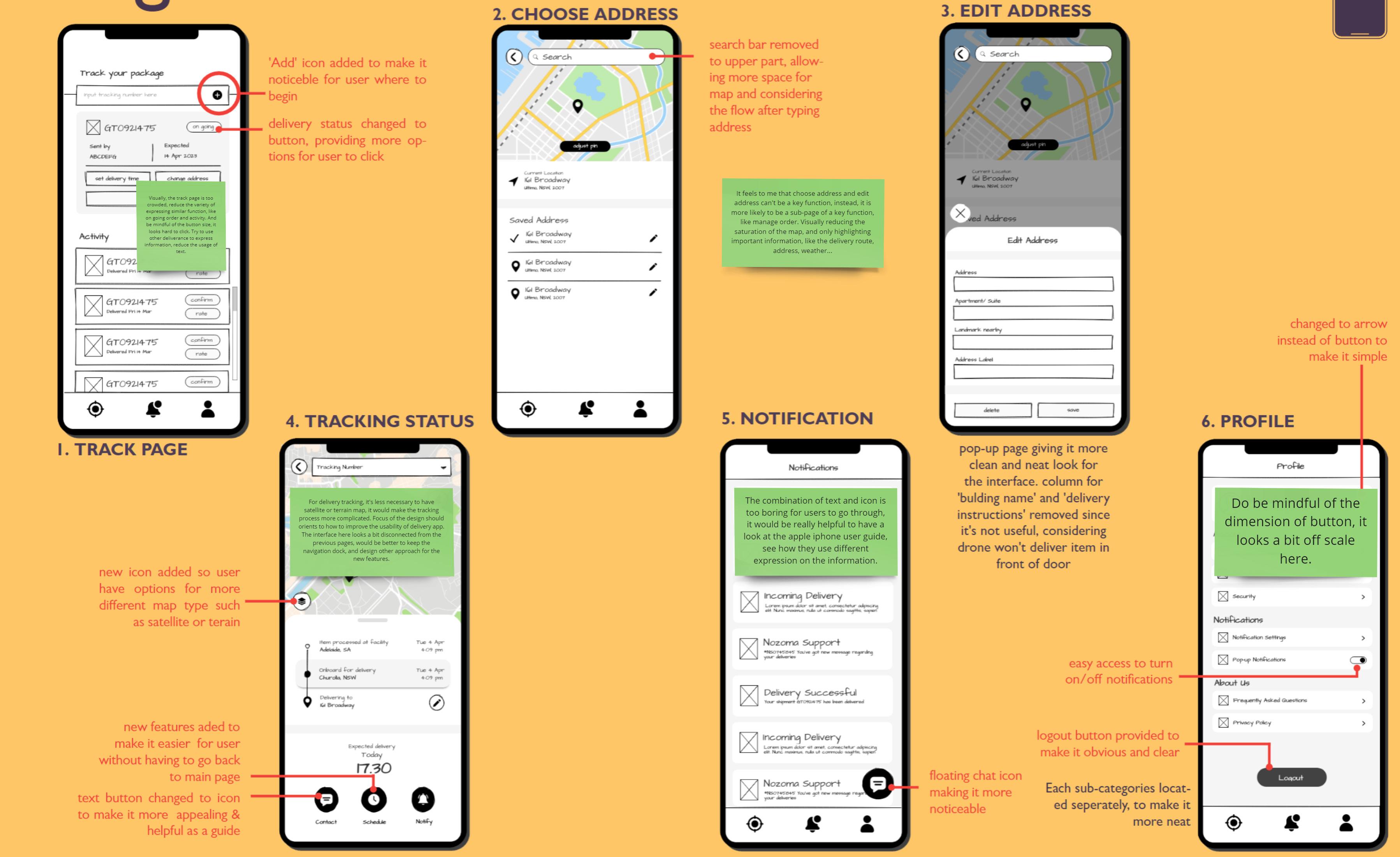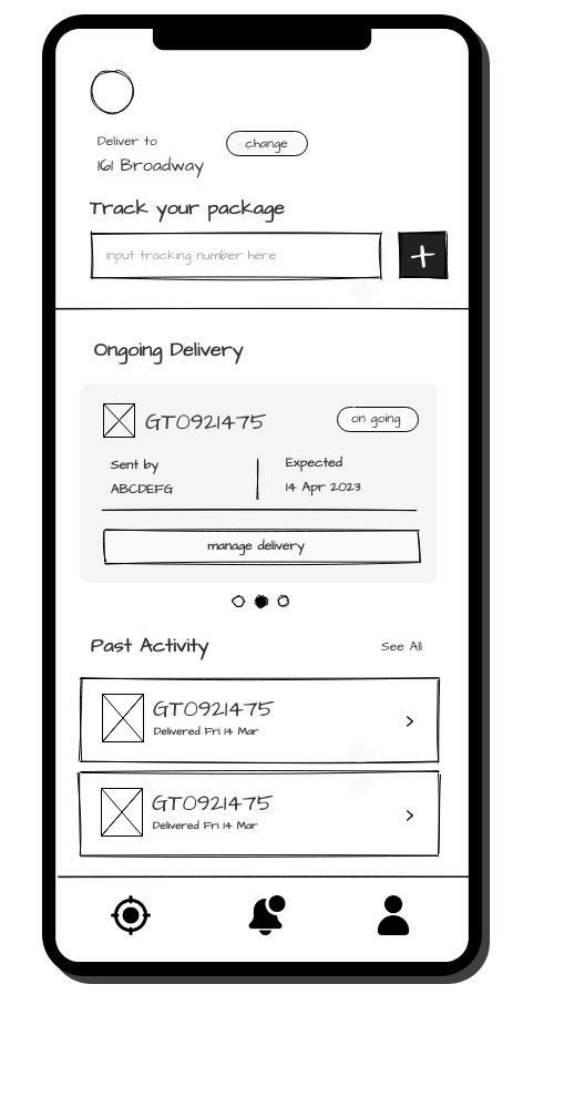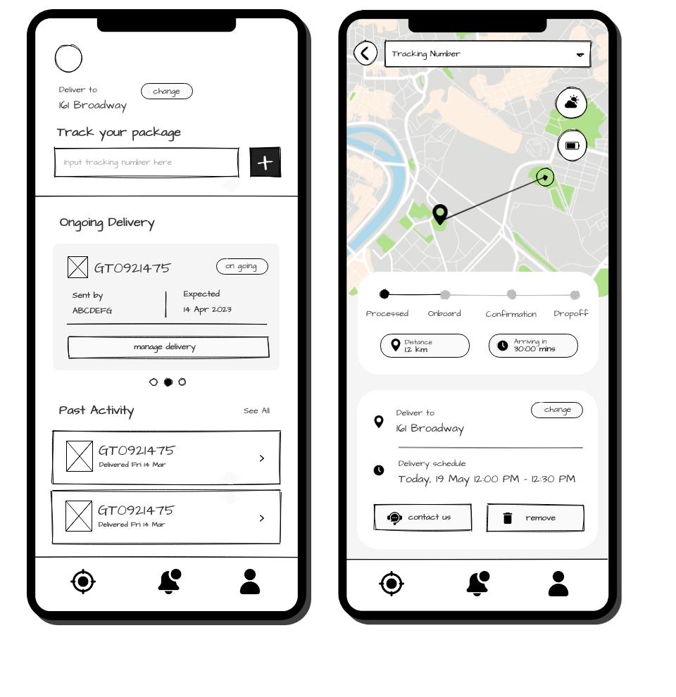 In the previous wireframe, interface shown too much information in one page, search bar for tracking number might be unnoticeable and too much elements. Therefore, improvements were made such as reducing the button in on going delivery to only one button, enlarge the tracking number section, also making past activity section more neat.