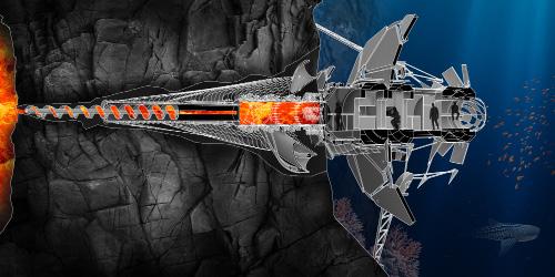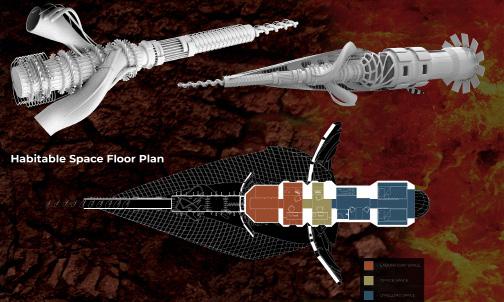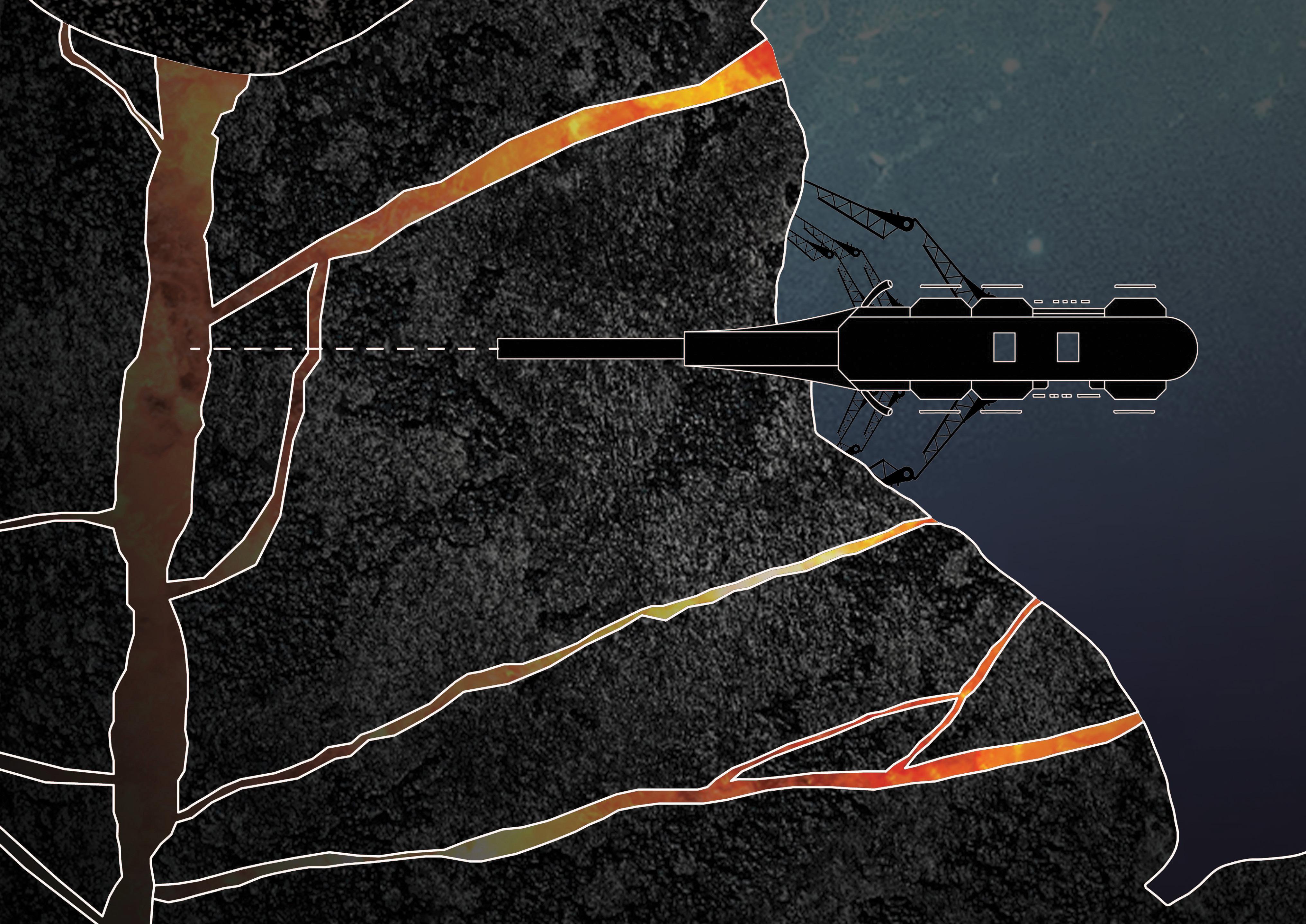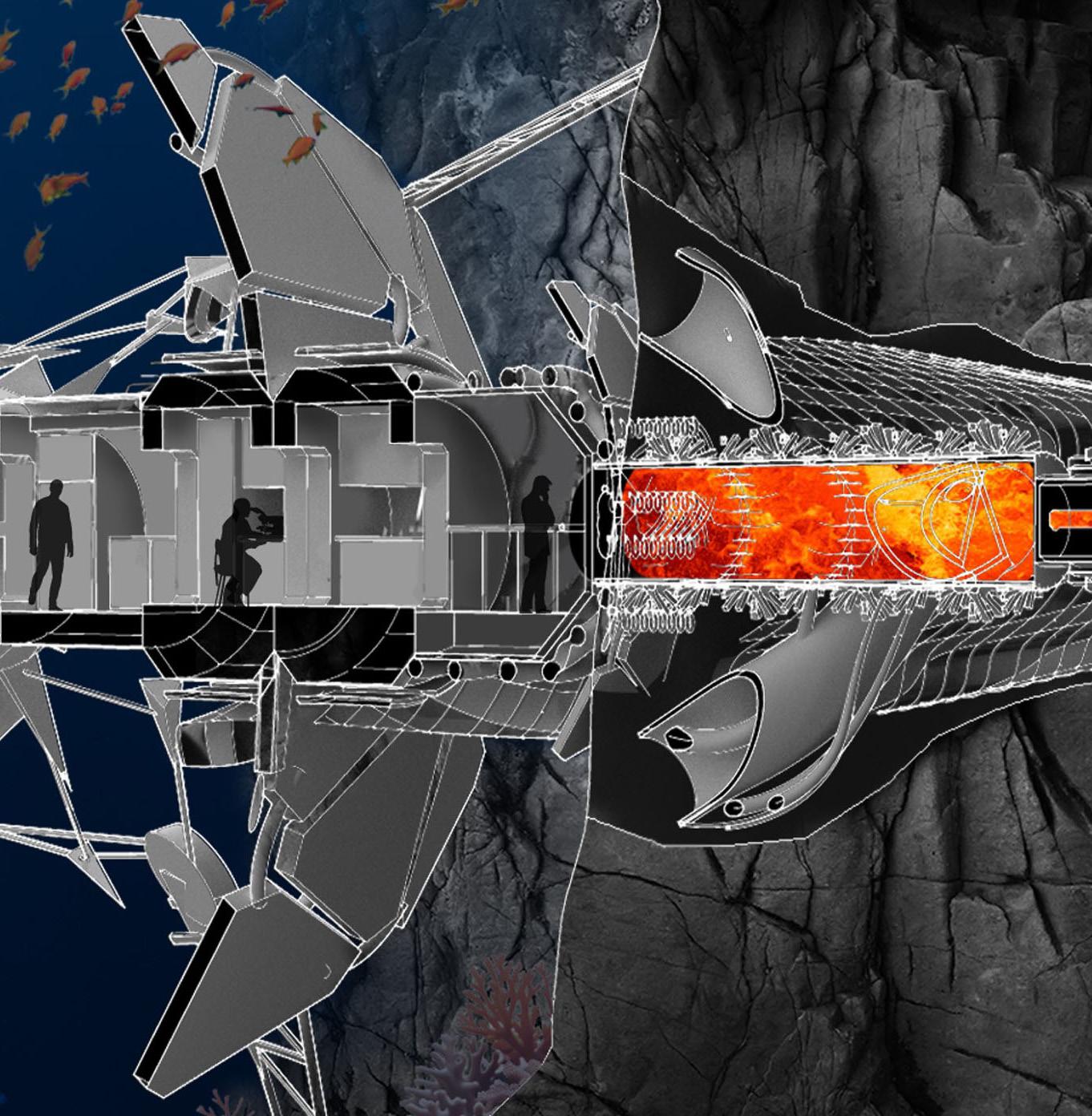 The international design competition called for a mobile marine research lab able to transport itself to various areas of study in the ocean. The station must address issues of sustainability, adaptability, and future technology. This architectural concept embodies a dynamic scientific research lab attached to a mechanical drill able to drill into an underwater volcano to harvest thermal energy.