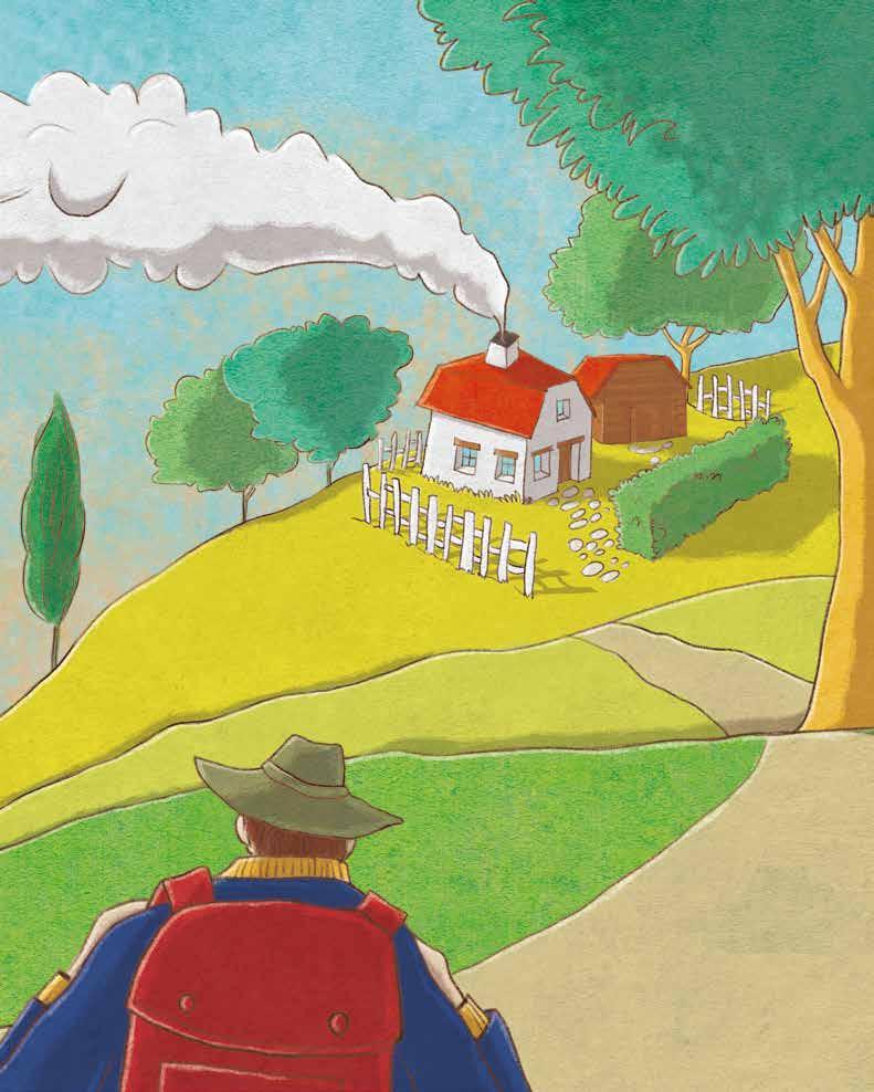 APERTOU LOGO SEU PASSO, POIS NA LINHA DO HORIZONTE VIU UM ROLO DE FUMAÇA SAINDO DA CHAMINÉ DO TELHADO DUMA CASA. “EIS O MEU DIA DE SORTE!”