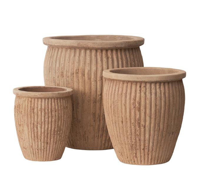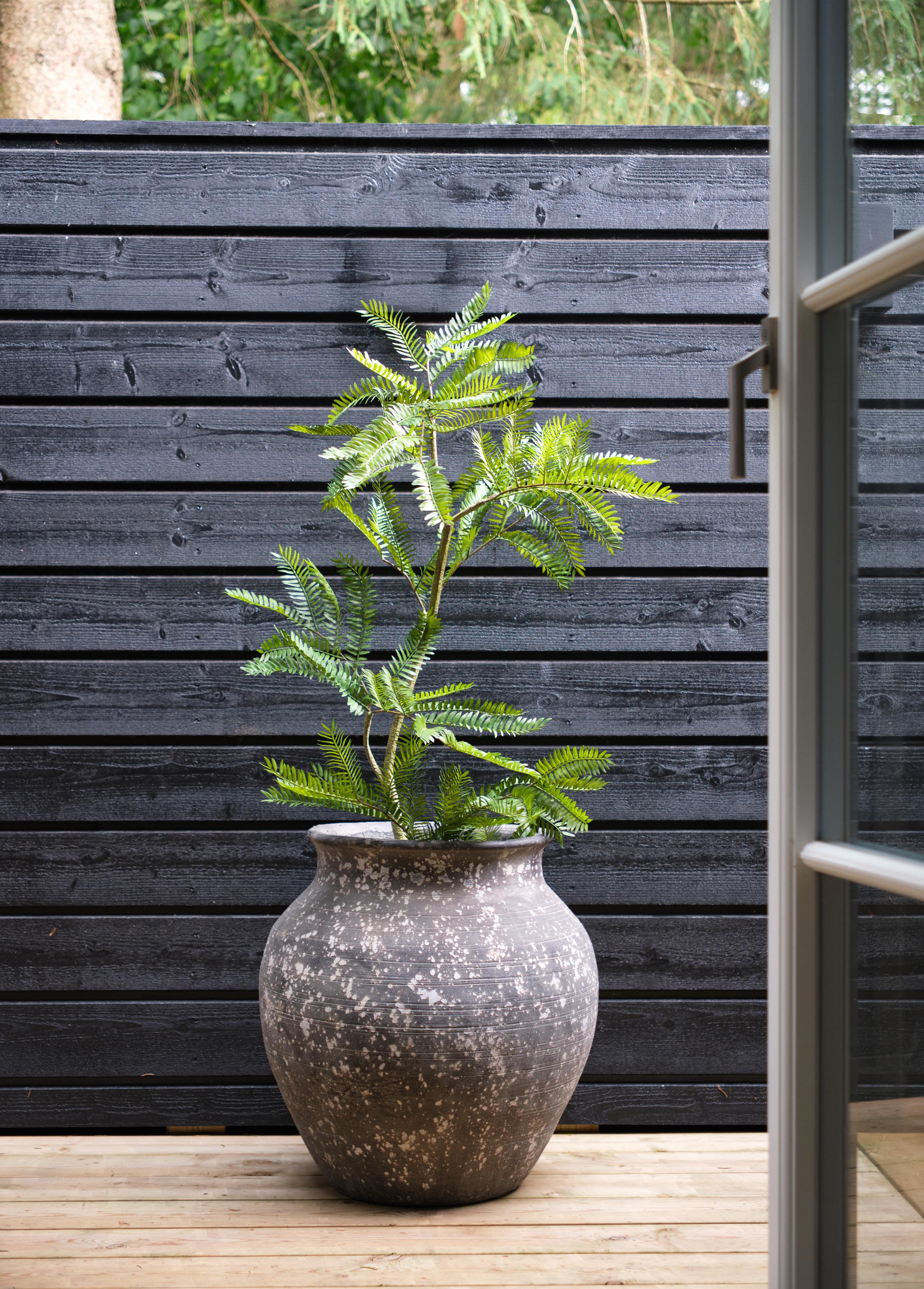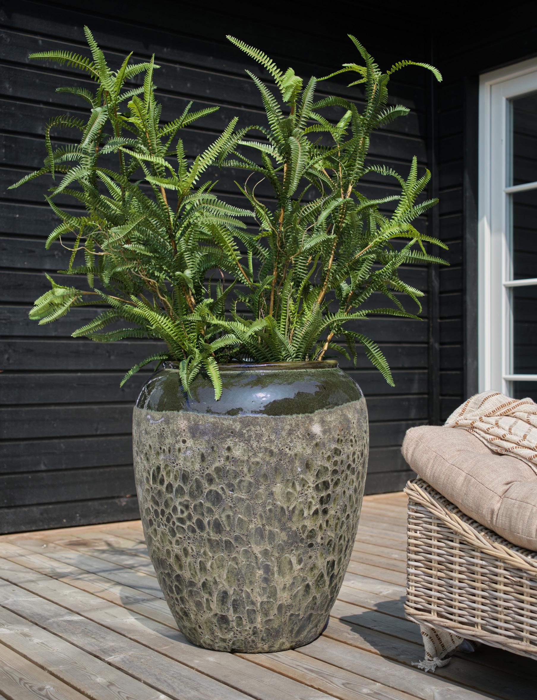 Mixing different ceramic pots with large, green plants adds atmosphere to your outdoor spaces. Play with shapes, sizes, and surfaces to create cozy corners, frame entrances, or place simple focal points in the garden.