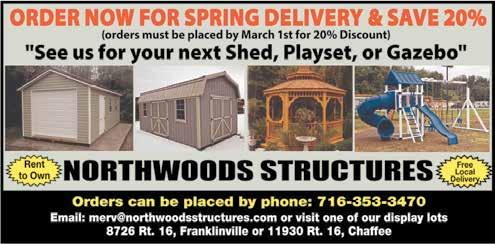PAGE 20 / APRIL 1, 2023 EDEN-NORTH COLLINS PENNYSAVER PRSRT STD U.S. POSTAGE PAID HAMBURG, NY PERMIT NO. 20 POSTAL CUSTOMER *****ECRWSSEDDM***** Like Us On Facebook! EdenNorth Collins Pennysaver Clydesfeed.com is now an e-commerce site site... Check it out today! 648- 2171 • 351 Union St., Hamburg Open Mon. - Fri. 9am - 7pm; Sat. 9am - 5pm; closed Sun. Everyday Low Price! 50 lbs. for Earth Animal Flea & Tick Products Kalmbach Layer Pellets 50 lbs. for $14.99 100 lbs. for $28.99 Great for Egg Production! Black Oil Sunflower Seeds Canidae Pure Grain Free Salmon Rock Salt $2.00 OFF $7.99 $10.00 OFF any size Exp. 4/30/23, limit two per customer Exp. 4/30/23, limit one per customer Everyday Low Price! 50 lbs. for $34.99 GABRIEL G JOHNSON 716-992-9172 2724 W CHURCH ST EDEN NY www.laingfuneralhome.com