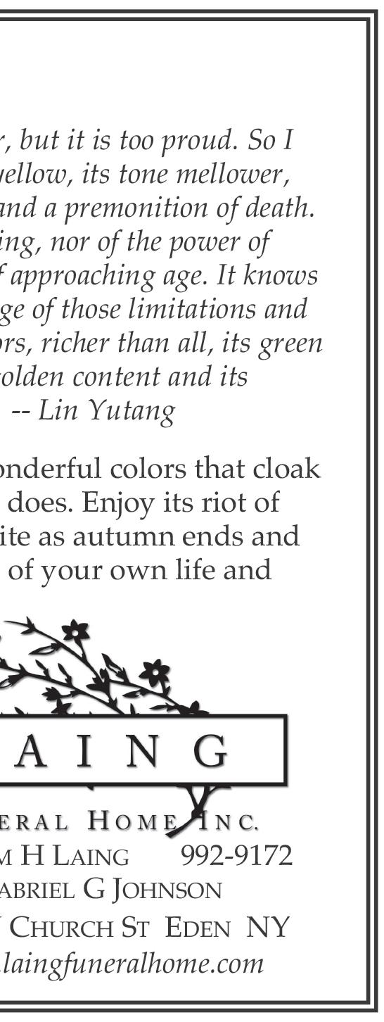 PAGE 2 / OCTOBER 1, 2022 EDEN-NORTH COLLINS PENNYSAVER 716 - 479-7261 Licensed Master Plumbers • Fully Insured • Locally Owned & Operated Specializing in Natural Gas, Water, Sewer & Electric Now Offering a variety of trenchless methods to minimize property damage! Trenchless Underground Utility Construction Commercial & Residential Service & Installation www.eastauroraevents.com 11167 Big Tree Rd. (20a), East Aurora, NY 14052 East Aurora Flea Market Vendors Wanted! Open Year-round! Sell your items all year! Garage Bays: 12x25 w/ 12x25 attic. Heated. Alarmed. Only $300 a month! Emporium Bldg: 11x12 locked spaces with shelving. Only $175 a month! Saturday & Sunday ONLY Opens 9a Call 716.655.7500 –––––––––•–– WE ARE HIRING ––•––––––––YOUTH DEVELOPMENT PROFESSIONALS ● Create an environment that facilitates the achievement of Youth Development Outcomes ● Promote and stimulate program participation ● Provide guidance and role modeling to members FRONT DESK - Eden ● Part-time ● Monday-Friday availability ● Must be at least 16 years of age CONTACT: Executive Director, Michelle Wilson, at (716) 992-2702 Michelle@bgcedenlakeshore.org 11 Main Street • Hamburg, NY 14075 716-648-7000 www.attealaw.com Personal Injury | Wills, Trusts, Power of Attorneys and Health Care Proxies Estate Planning and Elder Law | Estate Settlement and Litigation Residential and Commercial Real Estate Business Formations, Purchases, Sales, and Counseling Civil and Commercial Litigation | Guardianship Proceedings Criminal, DWI, Vehicle and Traffic | Matrimonial/Family Law Divorce Mediation Services | Landlord and Tenant Law | Bankruptcy Law ATTEA & ATTEA, P.C. ATTORNEYS AT LAW B RIAN F. ATTEA, E S q. R ICHARD J. ATTEA, E S q. RYAN F. M CC ANN, E S q. M ICHAEL PYS z, E S q. K EVIN R Au TENSTRAu CH, E S q. N ICH o LAS P. D E MARCo, ES q D EB o RAH M. B AR o NE, E S q. M ICHAEL F. B AR o NE, E S q. Serving Western New York and the Southern Tier for Over 40 Years BRIAN F. ATTEA, ESQ. RICHARD J ATTEA, ESQ. RYAN F. McCANN, ESQ. KEVIN RAUTENSTRAUCH, ESQ. MARY KAY LaFORCE, ESQ. NICHOLAS P. TUTTLE, ESQ. “Where Friendly Service is a Family Tradition” LUMBER HEADQUARTERS • Premium Vinyl Siding • Paint • Doors & Windows • Quality Wood • Tools • Insulation • Barns & Sheds SIXT LUMBER Lumberyard, Hardware Store & so much more! 619 Rock City St., Little Valley, NY 14755 (716)938-6521 or 1-800-836-0769 fax: 938-6710 13990 E. Schutt Rd., Chaffee, NY 14030 (716)492-2390 or (716)496-8964 fax: (716)492-1012 website: www.johnsixtlumber.com