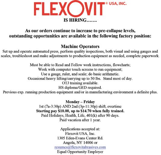 needed, complete paperwork. Join for competitive 1305 Eden-Evans Center Road, Angola NY 14006 MACHINE OPERATORS WANTED: Apply online at Company’s website: www.flexovitabrasives.com or stop by for an application.