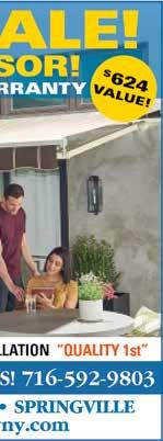 PAGE 12 / APRIL 8, 2023 EDEN-NORTH COLLINS PENNYSAVER PRSRT STD U.S. POSTAGE PAID HAMBURG, NY PERMIT NO. 20 POSTAL CUSTOMER *****ECRWSSEDDM***** Like Us On Facebook! EdenNorth Collins Pennysaver 8584 Main St., Eden, NY 14057 992-3488 • Fax: 992-9398 RANDALL AGENCY, INC. INSURANCE • Automobile • Homeowners • Renters • Recreational Vehicles • Farm • Business • Bonds Life THINK SPRING! Call ahead and save for your outside prevention program to protect your home or business from crawling and flying insects. 716-768-0125 2558 Hamburg Turnpike Suite 210, Lackawanna, NY 14218 buffalobugs.com SERVICING ALL OF WNY! CALL FOR PRICING: EDEN LEGION HALL FOR RENT Newell- Faulkner Post 880 716-992-3304 Relaxing, Luxurious Suites... Jacuzzi Tubs • Wet Bar • Gas Fireplaces THE FIELDS OF EDEN INN THE FIELDS OF EDEN INN 8633 S. Main Street Eden, NY 14057 Answering Service: (716) 575-4411 BOOK ONLINE AT www.EdenInn.com It is the ultimate comfort for your friends and family! Clydesfeed.com is now an e-commerce site site... Check it out today! 648- 2171 • 351 Union St., Hamburg Open Mon. - Fri. 9am - 7pm; Sat. 9am - 5pm; closed Sun. Everyday Low Price! 3 cubic ft. Earth Animal Large No Hide 2 pack Kalmbach 20% Starter Feed 50 lbs. for $20.28 100 lbs. for $38.16 Great for Healthy Development! Black Oil Sunflower Seeds Canidae Dog Food Sunshine Grower Mix #4 $3.00 OFF $25.99 25% OFF bags bigger than 21 lbs. Exp. 5/31/23, limit two per customer Exp. 4/30/23 Everyday Low Price! 50 lbs. for $34.99 EDEN TRUCK & AUTO SUPPLY 8082 N. Main St., Eden (716) 992-4378 Prices valid 4/1/23 - 4/30/23 SAVE 32% $498 Oil Filter Wrench Swivel Style BK 7769020 /each OIL CHANGE SAVE 30% $343 Lumax Extra-Long Neck Plastic funnel BK 8215212 /each SAVE 57% NAPA Full Synthetic Motor Oil 10W30, 5W30, 5W20, 0W20 / 5 qt.$2499 $499 10W30, 15W50, 0W16, 5W30, 5W20, 0W20, 5W40 SAVE 34% Valvoline Motorcycle 4 Stroke Motor Oil Conventional 10W40 20W50 / 1 qt. $659 Valvoline ATV 4 Stroke Motor Oil Conventional 10W40 GABRIEL G JOHNSON 716-992-9172 2724 W CHURCH ST EDEN NY www.laingfuneralhome.com
