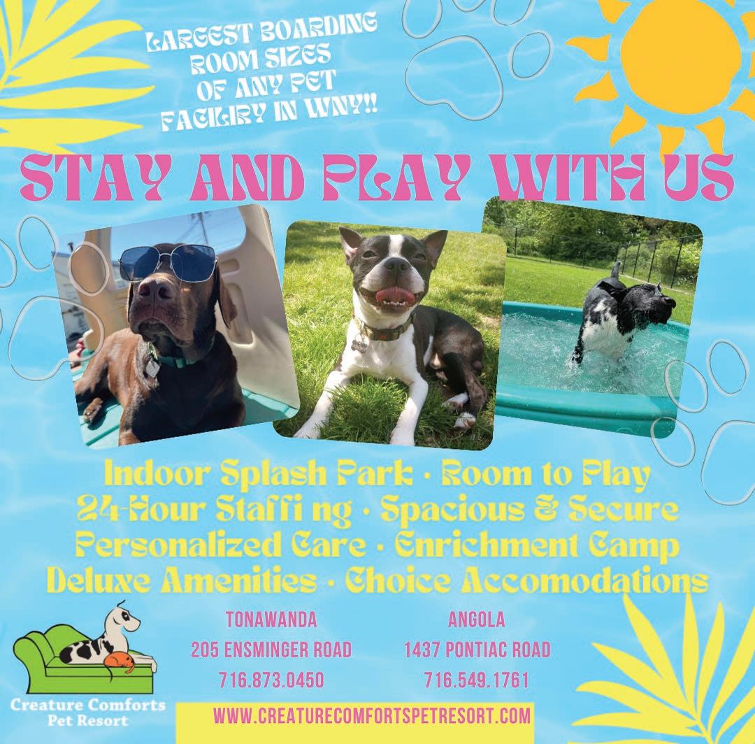 PET RESORT “WNY’s Premier Luxury Pet Resort!” 1437 Pontiac Rd. (off Southwestern Blvd.) Angola 549-1761 • www.creaturecomfortspetresort.com PET RESORT dogs & cats with web cams! • Grooming • Dog Daycare Training Extended Grooming Hours for the Holidays! Boarding DOG BOARDING & ENRICHMENT DAYCARE Golden Paws Pet Care Services Small, quiet setting with personalized care. All inclusive boarding prices, starting at $22.00 Golden Paws Pet Care Services Happy 8217 N. Main St., Eden, NY 14057 716-992-3477 Evcny@evcny.com Hours: Monday, Tuesday, Friday 11 am - 7 pm; Wednesdays 11 am - 5 pm; ursdays and Saturdays 9 am - 2 pm Hours: Monday, Tuesday, Friday 9 am - 5 pm Wednesday 9 am - 3 pm ursday 9 am - 3 pm Saturday & Sunday Closed Surgeries by appointment only Fluffy Puppy Grooming Spa 189 Buffalo Street, Hamburg, NY 14075 716-926-9226 Dog & Cat Grooming www.fluff ypuppyspa.com www.fluff ypuppy.net Bonnie Ball Owner & Groomer