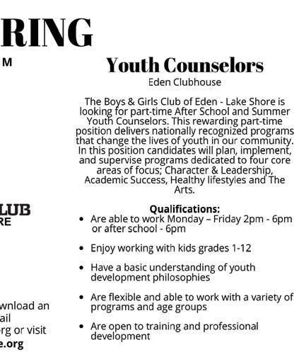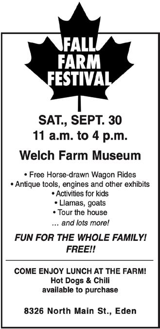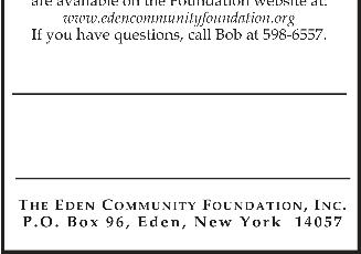8603 S. Main St., Eden, NY 14057 phone: 716-992-4625 fax: 716-992-3041 www.edenpennysaver.com OFFICE HOURS: Mon. - Wed. 9-3 • Thurs. 9-12 Proudly serving our community for over 65 years! LOCAL & AFFORDABLE ADVERTISING EDEN-NORTH COLLINS PENNYSAVER WE WANT YOUR COMMUNITY NEWS!!! The Eden- North Collins Pennysaver is looking for your news. Please send us photos and captions of community highlights, excellent academic, personal or business achievements! e-mail penny@edenpennysaver.com