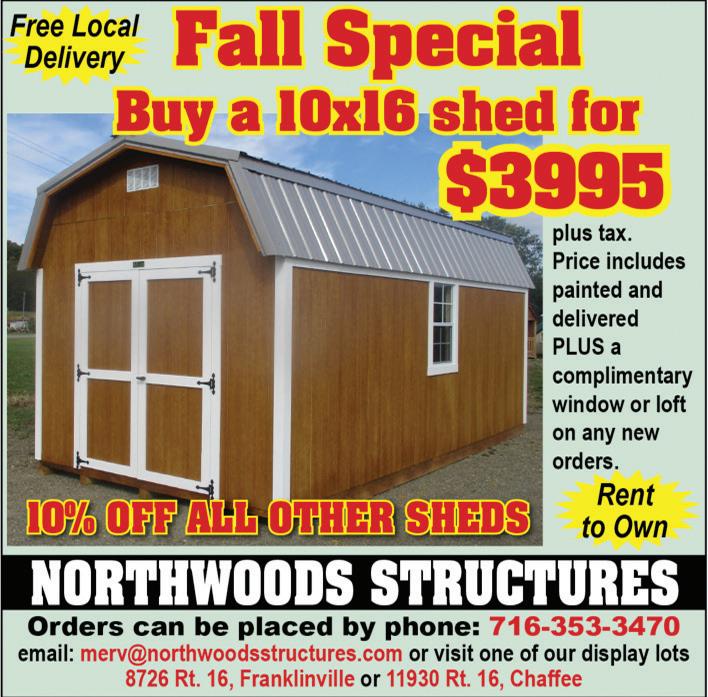 GARAGE SALE: 9927 Rt. 62/ Dayton Rd., Gowanda. Open every weekend. Last day Sept. 28th. 6-8ft tables full with items 4 for$1.00. 28ft tables with Jewelry, 4 for $1.00 ear rings, Amish building 12’ x 12’, chairs $5.00 each, lots of kid toys. Much More.