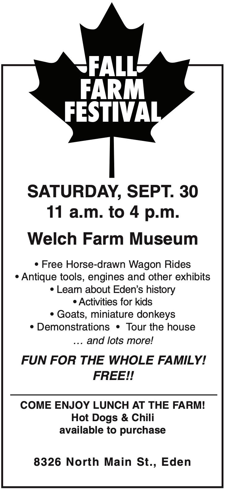 PAGE 4 / SEPTEMBER 30, 2023 EDEN-NORTH COLLINS PENNYSAVER ATTENTION Town of Eden Highway Dept CURBSIDE BRUSH COLLECTION October 2nd Branches to be Curbside by 7am on the following pickup start date… • Branches to be placed perpendicular to the road • Branches to be 6” or less diameter • Chunk pieces to be 6” or less diameter • Branches to be 10’ or less Yard and Tree Clean-up MICHAEL ABRAM 716.480.6168 FIREWOOD SPECIAL 3 Cord Delivered - Ash $250 Fall Dinn Eden Historical Society Tuesday, October 24th 6:00pm Four Corners Café RSVP NO LATER THAN OCT. 14th Carol @ 716-480-1671 or Allison @ 716-992-3377 All are welcome! A er Dinner speaker from Bu alo Naval Park $30.00 per person Full Course Turkey Dinner, Dessert, Beverage & Gratuity included •