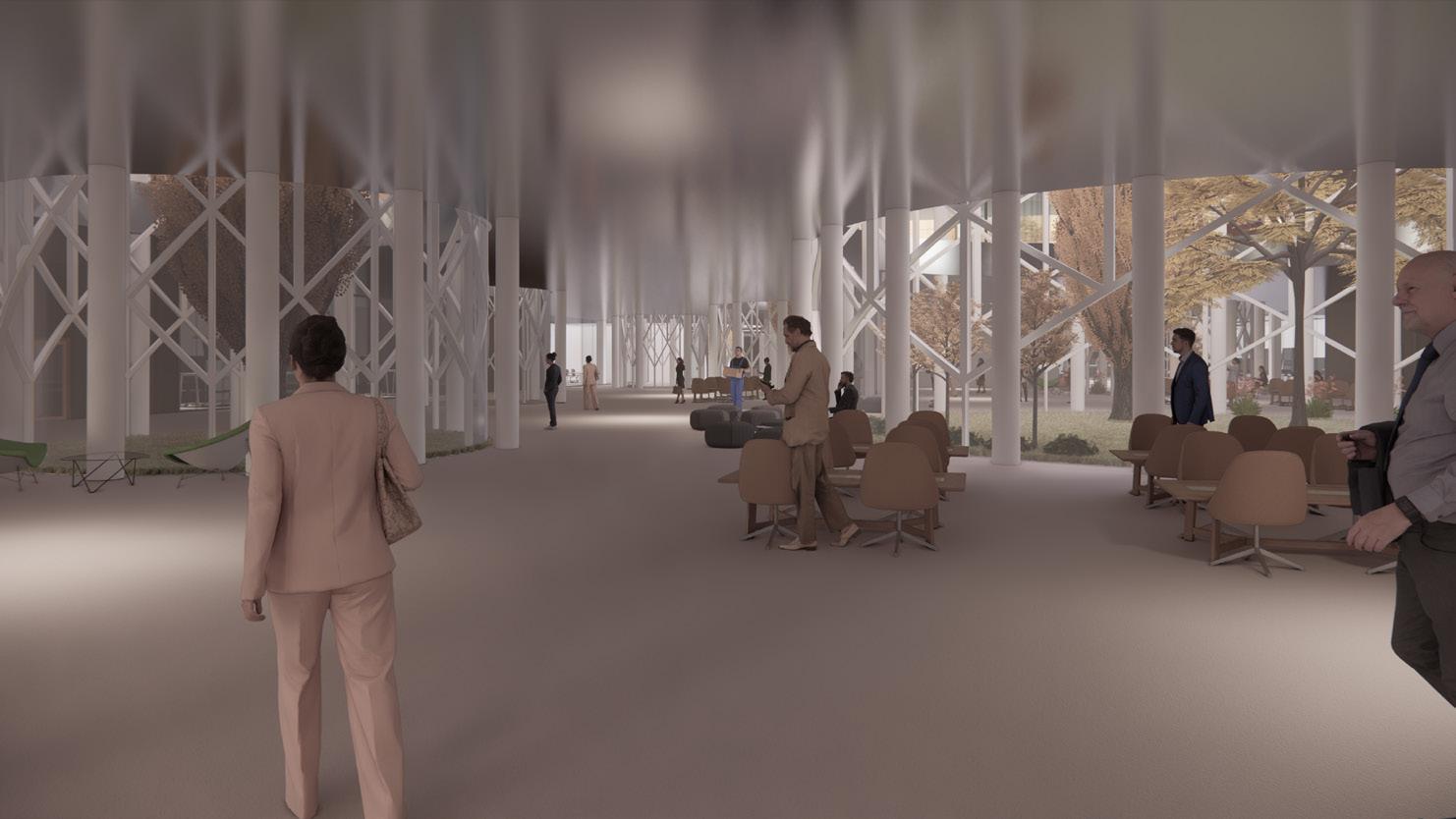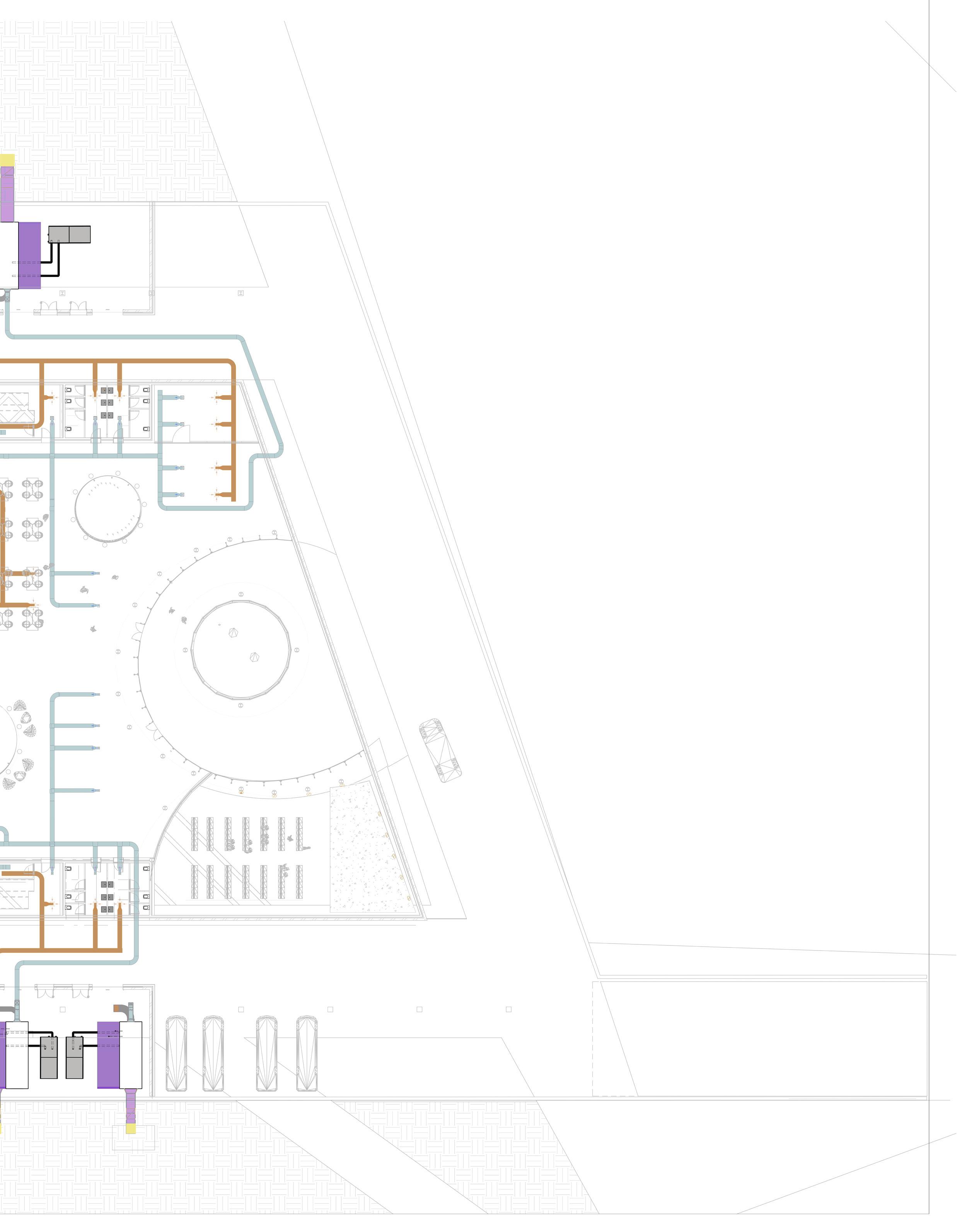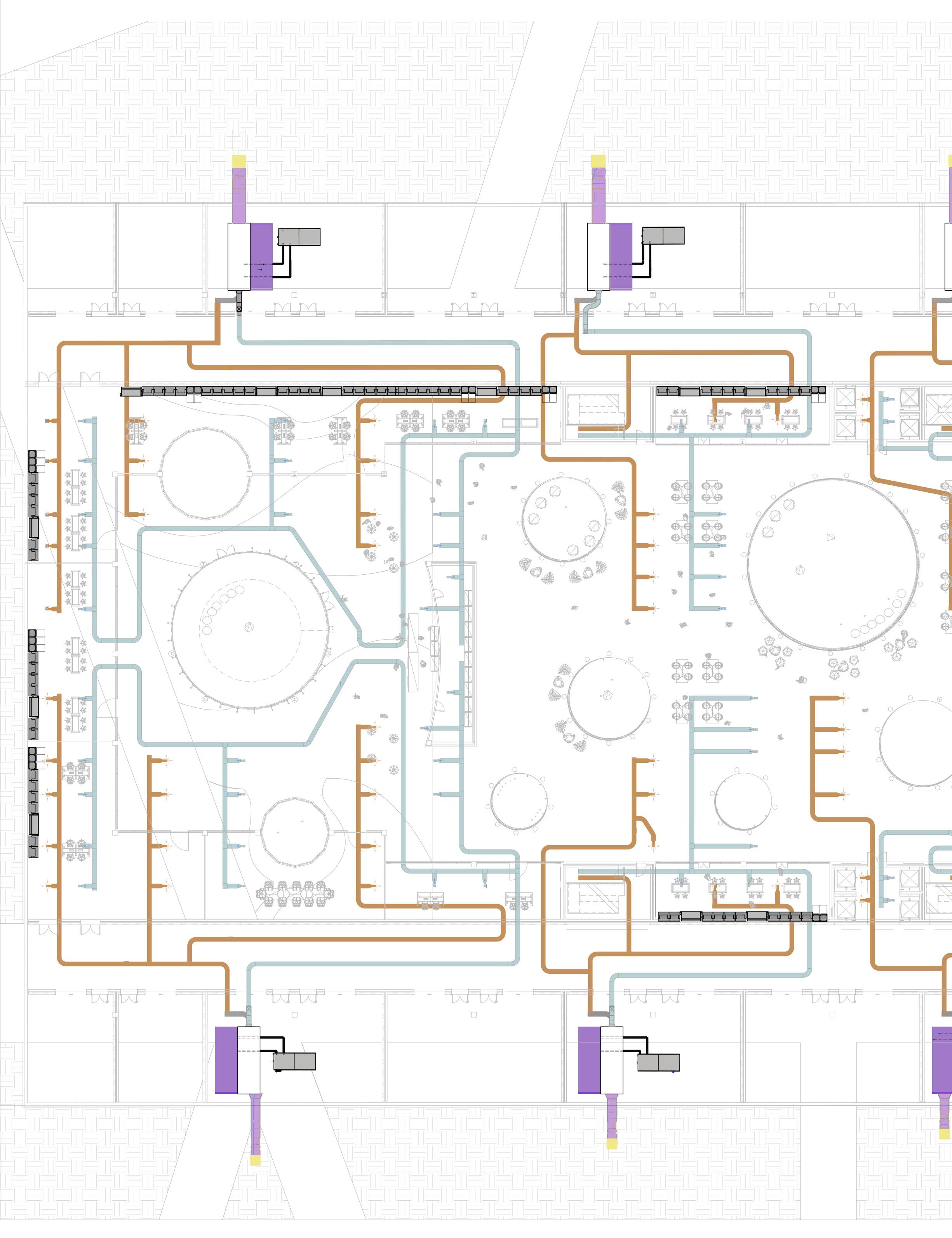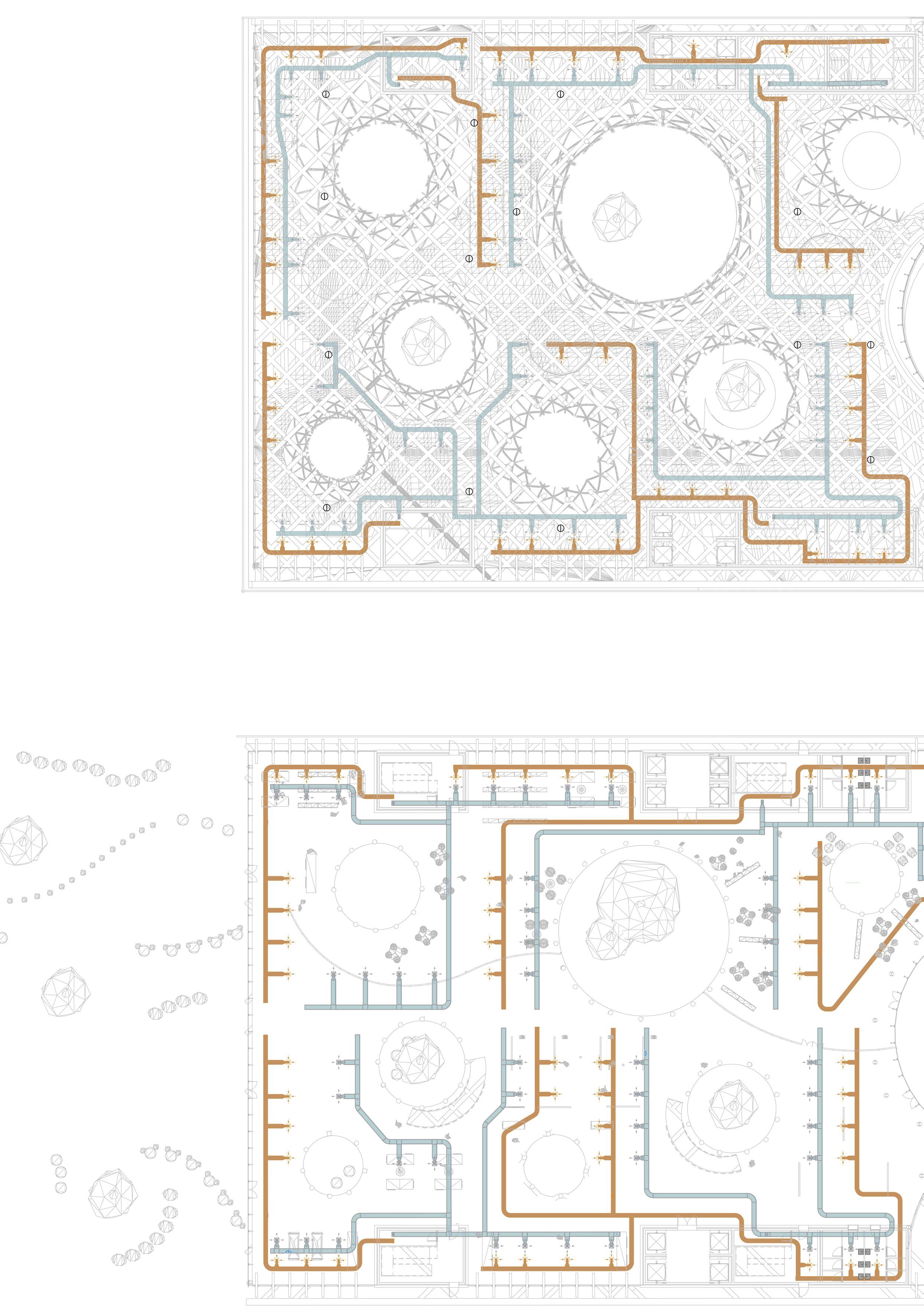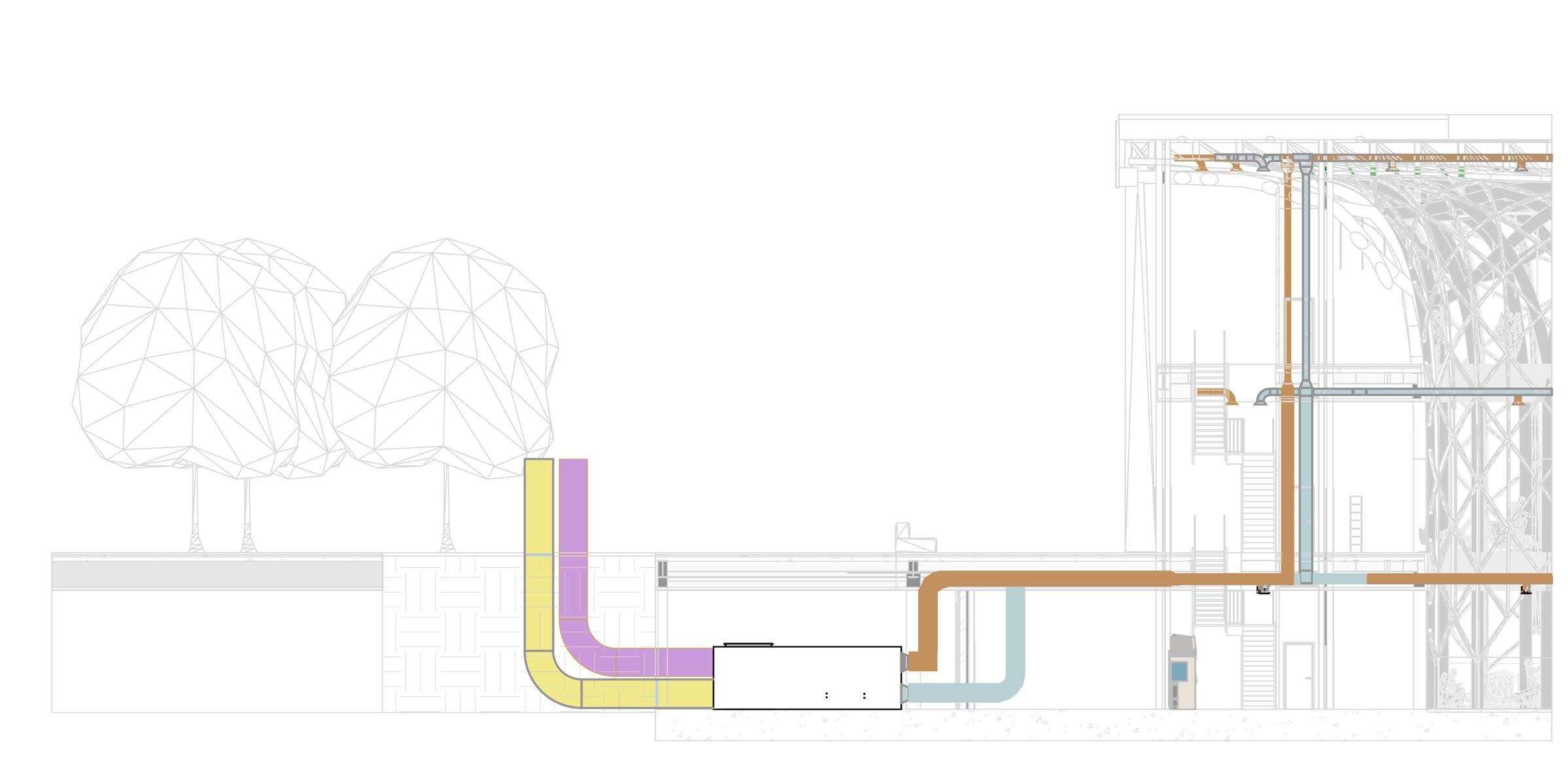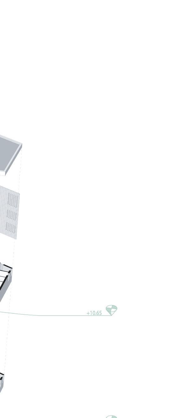 The HVAC system is completely underground, rather than on the roof, as is common in public buil dings. This was done for structu ral reasons concerning the loads on the parametric columns, in ad dition to aesthetic ones regarding the green roof being part of the green fabric. The decision, howe ver, prompted the requirement to separate/integrate the 3 m ducts rising from the underground within the context. The proposed solution is to place ‚urban totems,’ vertical components that comple ment the surrounding materials and protect the ducts from rain and wind while yet enabling air to pass through. The totems are located around the building’s pe rimeter and serve as technology hotspots throughout the park.