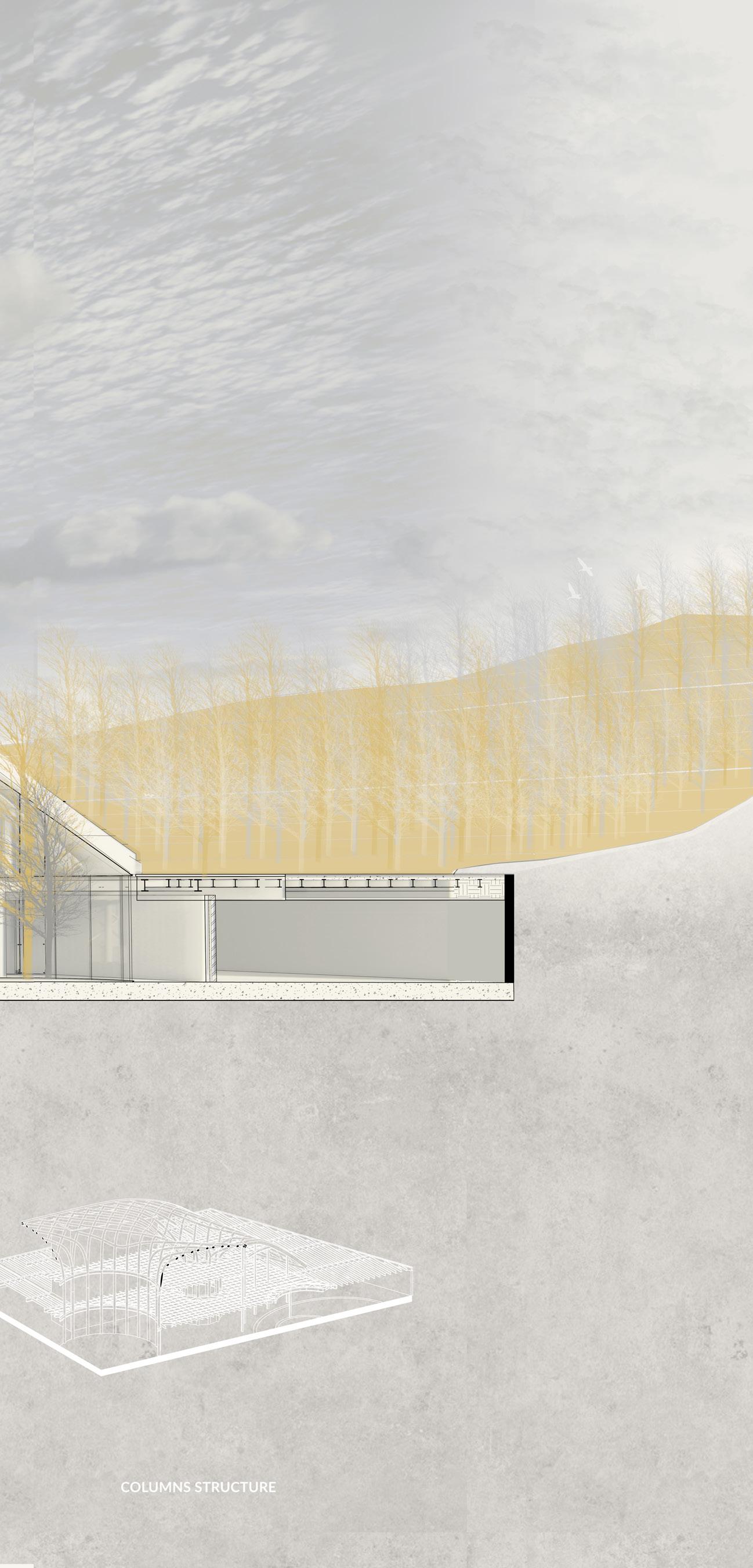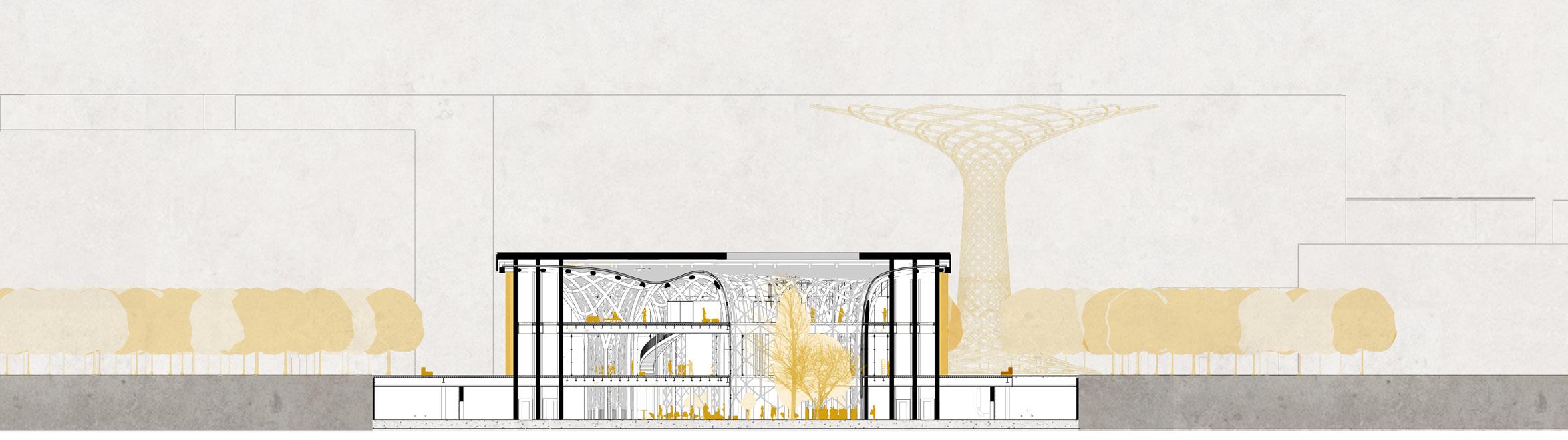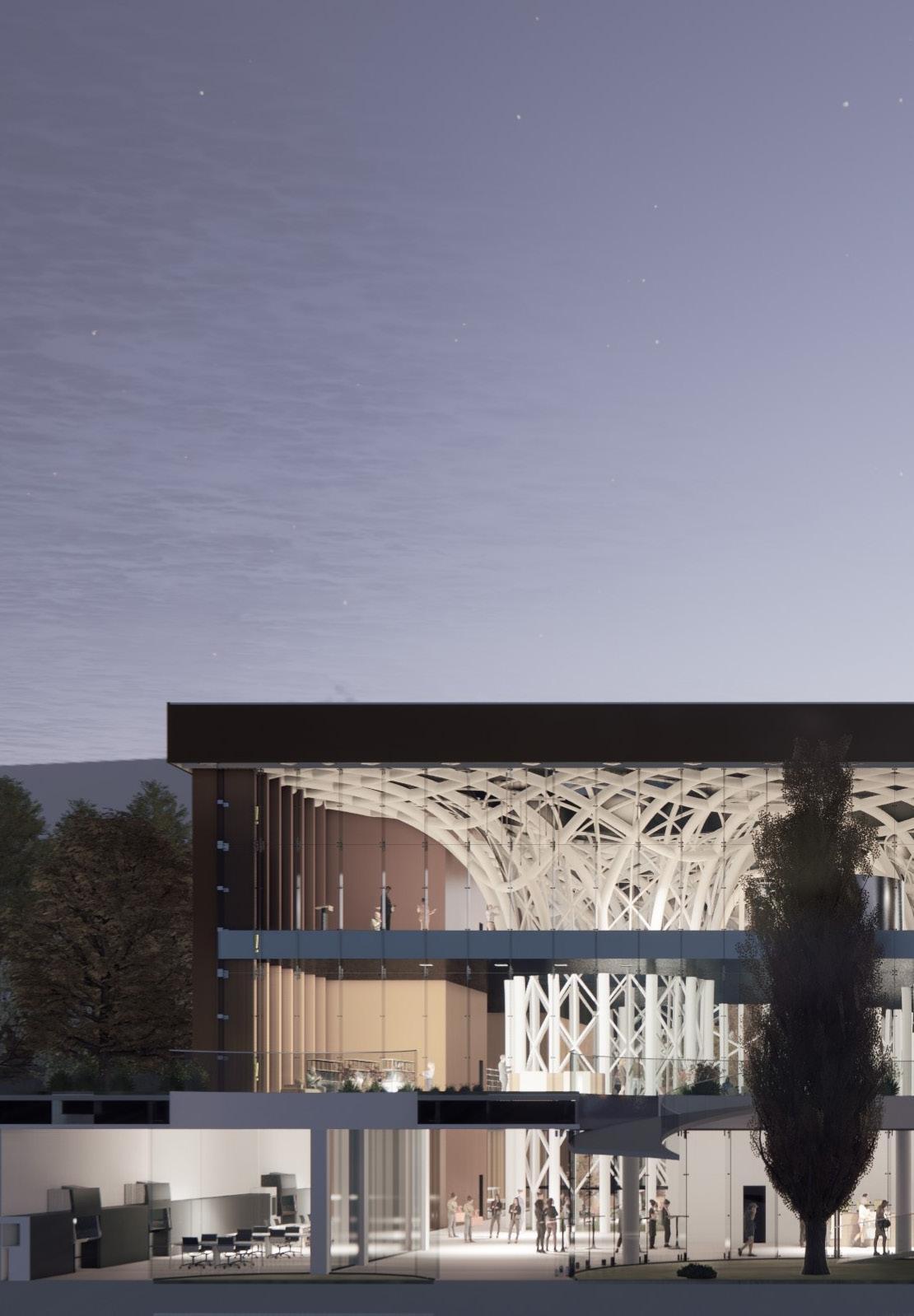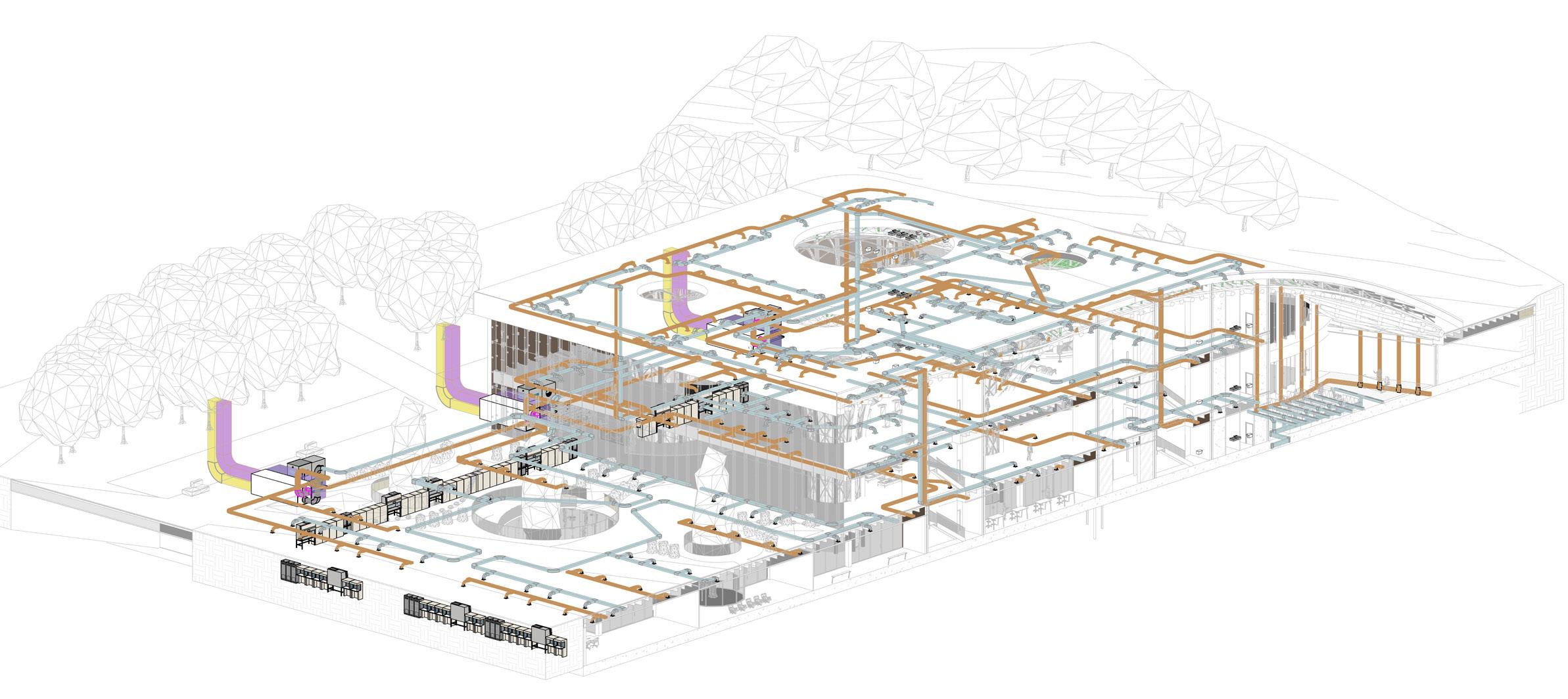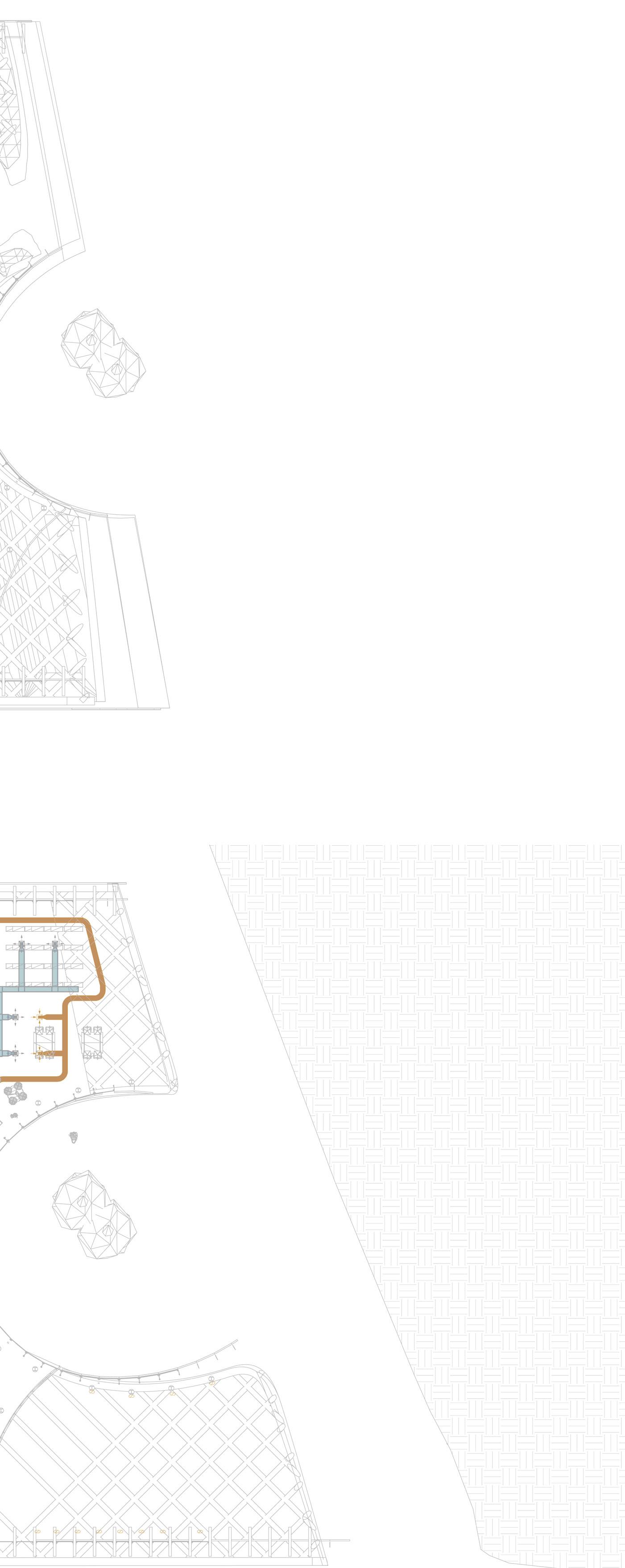The HVAC system is completely underground, rather than on the roof, as is common in public buil dings. This was done for structu ral reasons concerning the loads on the parametric columns, in ad dition to aesthetic ones regarding the green roof being part of the green fabric. The decision, howe ver, prompted the requirement to separate/integrate the 3 m ducts rising from the underground within the context. The proposed solution is to place ‚urban totems,’ vertical components that comple ment the surrounding materials and protect the ducts from rain and wind while yet enabling air to pass through. The totems are located around the building’s pe rimeter and serve as technology hotspots throughout the park.