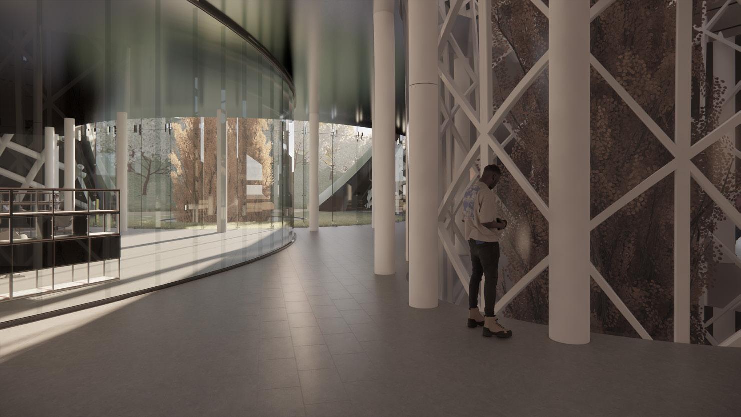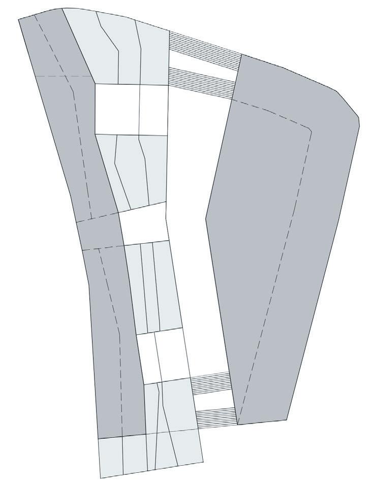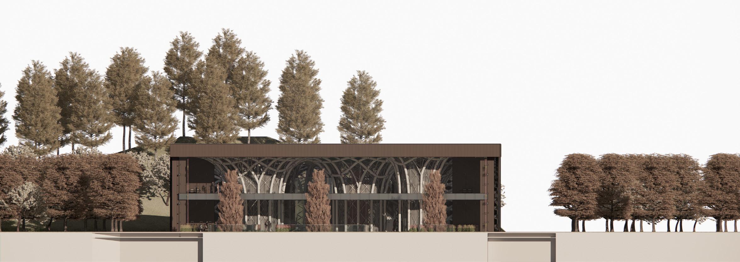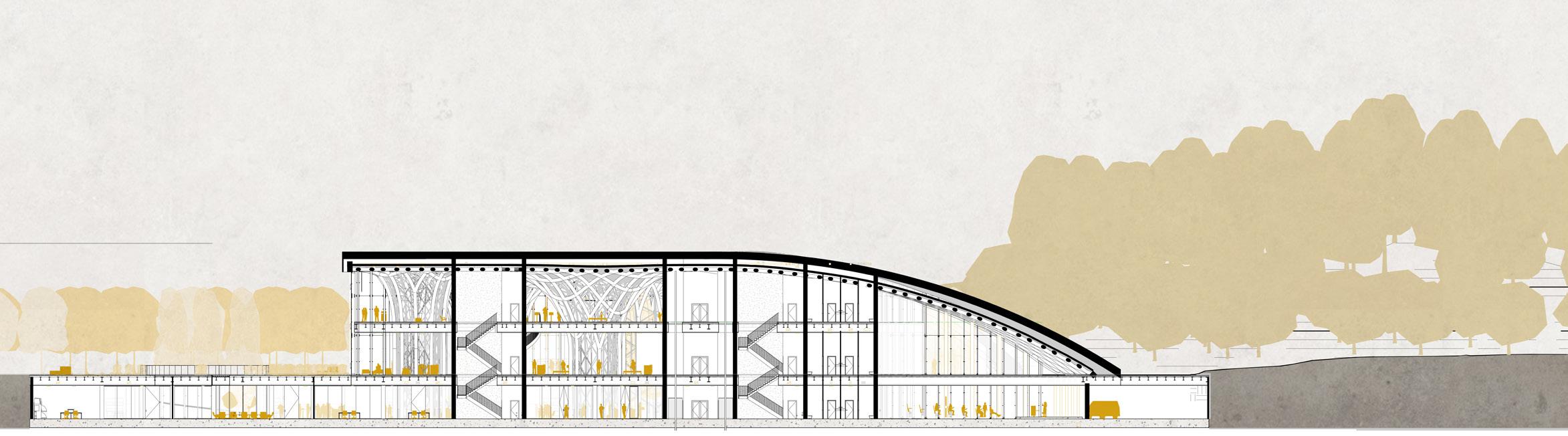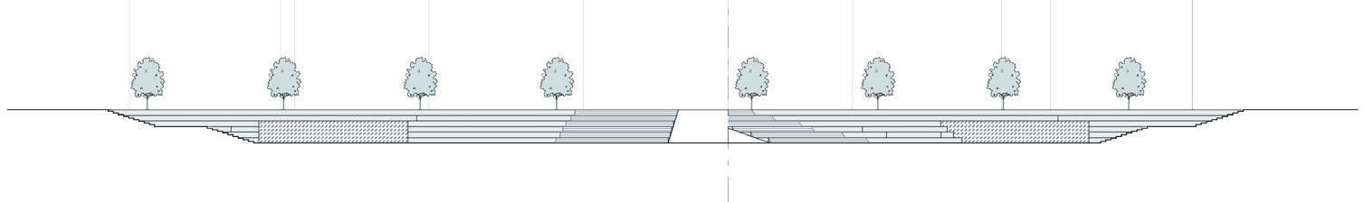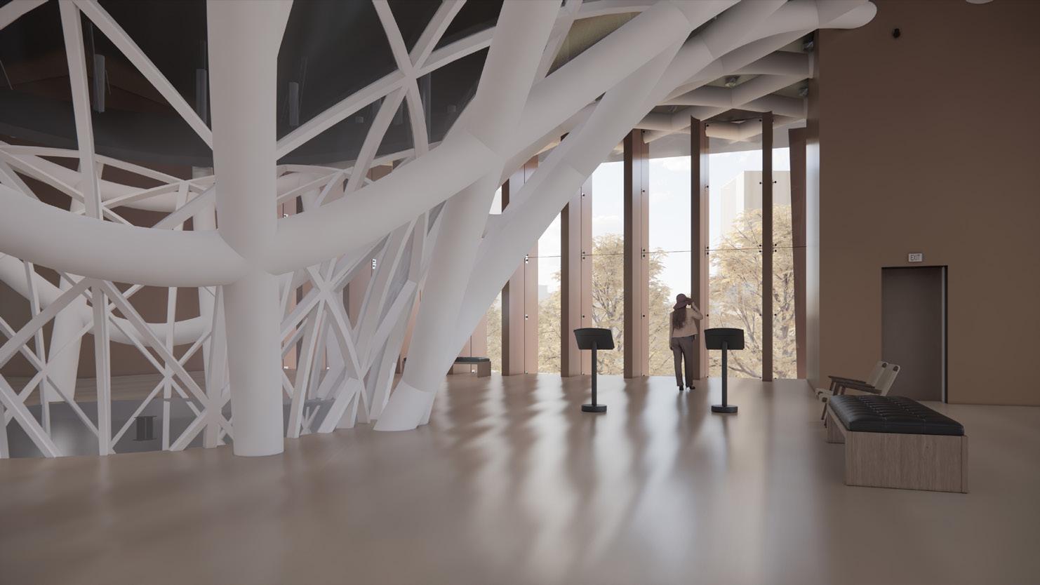 The HVAC system is completely underground, rather than on the roof, as is common in public buil dings. This was done for structu ral reasons concerning the loads on the parametric columns, in ad dition to aesthetic ones regarding the green roof being part of the green fabric. The decision, howe ver, prompted the requirement to separate/integrate the 3 m ducts rising from the underground within the context. The proposed solution is to place ‚urban totems,’ vertical components that comple ment the surrounding materials and protect the ducts from rain and wind while yet enabling air to pass through. The totems are located around the building’s pe rimeter and serve as technology hotspots throughout the park.