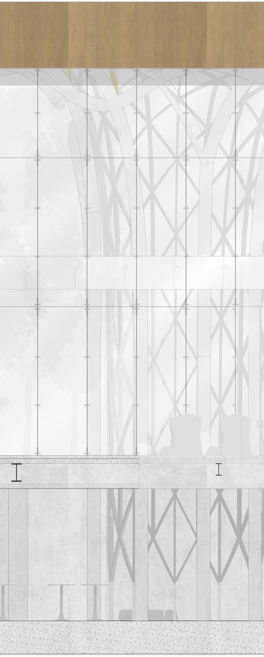 EXPLODED AXO. STRUCTURAL SUPPORTS Straight louvers serving as columns to provide extra support First floor plan 1:2000 Sectionl6/3 1:2000 Prof. Massimiliano Nastri Architectural Design Studio Complex Constructions 2 (A.Y. Students: Eden Nimni, Marianne 21 3 4 5 6 7 8 9 10 11 12 13 14 15 16 17 18 21 3 4 5 6 7 8 9 10 11 12 13 14 15 16 17 18 Technical Drawings: Structural 1st Level Structural Group: 11 Date: 22.06.2022 5 6 7 8 9 10 11 12 13 14 5 6 7 8 9 10 11 12 13 14 C D E F G H I C D E F G H A B C D E F G H I J K 1 2 3 0 5 6 7 8 9 10 11 12 13 144321 15 16 17 18 8000 8000 8000 8000 8000 8000 8000 8000 8000 -7000 -7300 Underground -5000 Groundfloor Level +13800 L8 3 L6 3 L6 3 L8 3 1 2 3 0 Raft Foundation Excavation Underground Level 1st Level +6000 Roof Level A2 3 L8 3 L7 3 L6 3 A1 3 1164 10 1164 mm 290 1500 160 120x200x10 rectangular steel tubes 120x200x10 rectangular steel tubes Aluminum composite panel with a wood grain pattern finish 8000 8000 8000 8000 8000 8000 48000 72000 8000 8000 8000 8000 8000 8000 8000 8000 8000 8000 80000 8000 8000 8000 8000 8000 8000 8000 8000 8000 8000 8000 8000 8000 8000 8000 8000 8000 136000 C2 C2 C2 C2 C2 T1 T1 C2 C2 C2 T1 T1 T1 HEB 550 HEB 550HEB 550 HEB 550 HEB 550 HEB 550 HEB 550HEB 550 HEB 550 HEB 550 HEB 550 IPE 500 HEB 550 IPE 500 IPE 500 HEB 550 IPE 500 IPE 500 HEB 550 IPE 500 HEB 550 IPE 500 IPE 500 HEB 550 IPE 500 IPE 500 HEB 550 IPE 500 IPE 500 IPE 500 HEB 550 HEB 550 HEB 550 HEB 550 HEB 550 W2 W2 W2W2 W2 W2 T1 T1 T1 W2 W2 W2 W2 W1 W1W1 W2W2W2 C1 C2 C3 T1 W1 W2 IPE 500 IPE 330 HEB 550 Cod. column 1 column 2 column 3 tube 1 wall 1, retaining wall wall 2, concrete core secondary beam secondary beam primary beam Technical Element steel steel Concrete Material C25 C25 IPE 500 IPE 330 HEB 550 Element Code HEA HEA HEA d = Dimensions Concrete steel steel steel steel steel w w H H H Prof. Massimiliano Nastri Architectural Design Studio for Complex Constructions 2 (A.Y. 2021-2022) Students: Eden Nimni, Marianne Esses, 2 3 4 5 6 7 8 9 10 11 12 13 14 15 16 17 18 19 2 3 4 5 6 7 8 9 10 11 12 13 14 15 16 17 18 19 Technical Drawings: Structural Sections L6 1st Level Structural Plan Structural Louver Detail Group: 11 Date: 22.06.2022 5 6 7 8 9 10 11 12 13 14 5 6 7 8 9 10 11 12 13 14 C D E F G H C D E F G H I A B C D E F G H J K 1 2 3 0 5 6 7 8 9 10 11 12 13 144321 15 16 17 18 8000 8000 8000 8000 8000 8000 8000 8000 8000 Underground 1st Level L8 3 L6 3 L6 3 L8 3 1 2 3 0 Raft Foundation -7000 -7300 Underground -5000 Groundfloor Level 0 +13800 A2 3 L8 3 L7 3 L6 3 A1 3 1164 10 x 1164 mm 290 1500 160 120x200x10 rectangular steel tubes 120x200x10 rectangular steel tubes Aluminum composite panel with a wood grain pattern finish 8000 8000 8000 8000 8000 8000 48000 72000 8000 8000 8000 8000 8000 8000 8000 8000 8000 8000 80000 8000 8000 8000 8000 8000 8000 8000 8000 8000 8000 8000 8000 8000 8000 8000 8000 8000 136000 C1 C2 C2 C2 C2 C2 C2 T1 C2 C2 T1 T1 T1 T1 T1 HEB 550 HEB 550HEB 550 HEB 550 HEB 550 HEB 550 HEB 550HEB 550 HEB 550 HEB 550 HEB 550 IPE 500 HEB 550 IPE 500 IPE 500 HEB 550 IPE 500 IPE 500 HEB 550 IPE 500 HEB 550 IPE 500 IPE 500 HEB 550 IPE 500 IPE 500 HEB 550 IPE 500 IPE 500 IPE 500 HEB 550 HEB 550 HEB 550 HEB 550 HEB 550 W2 W2 W2 T1 T1 W1 W1W1 T1 T1 C1 C2 C3 T1 W1 W2 IPE 500 IPE 330 HEB 550 Cod. column 1 column 2 column 3 tube 1 wall 1, retaining wall wall 2, concrete core secondary beam secondary beam primary beam Technical Element steel steel Concrete Material C25 C25 IPE 500 IPE 330 HEB 550 Element Code HEA 500 HEA 500 HEA 300 d = 40 cm, Dimensions Concrete steel steel steel steel steel w = 40 cm, w = 40 cm, H = 55 cm, H = 50 cm, H = 33 cm,