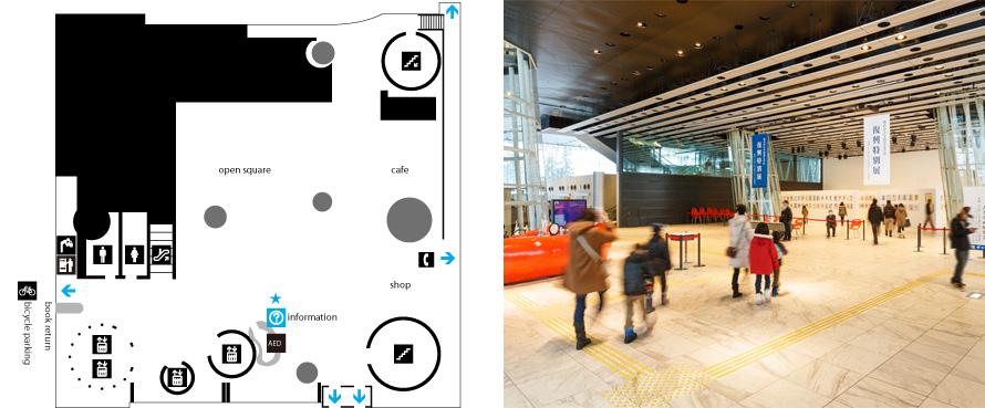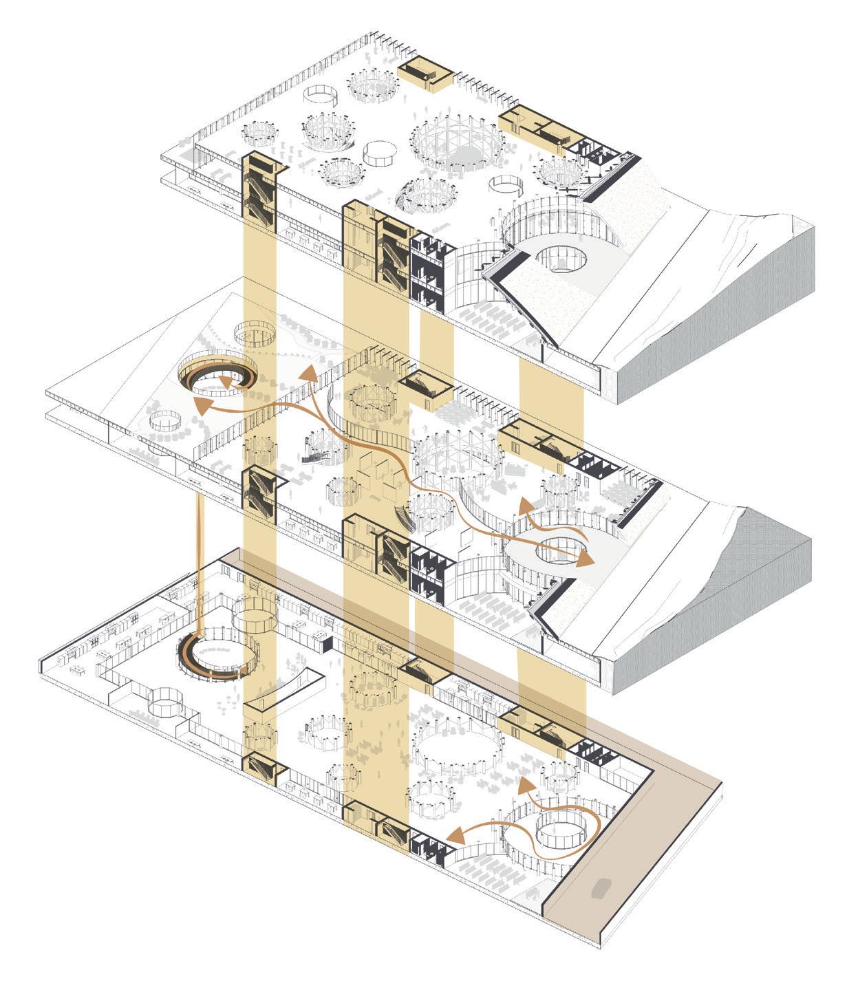 Davanti alla facciata principale del museo, direttamente dal parco, il percorso principale introduce in questo “terreno abitato”, l’ambiente dell’innovazione e della ricerca, attraverso la rampa principale che penetra in modo scenografico nel livello ipogeo.