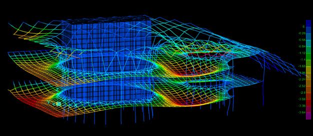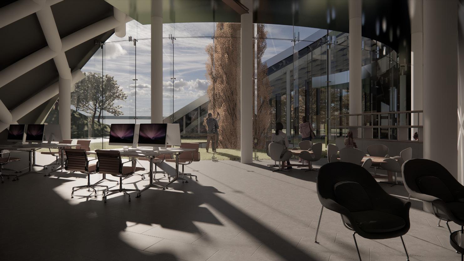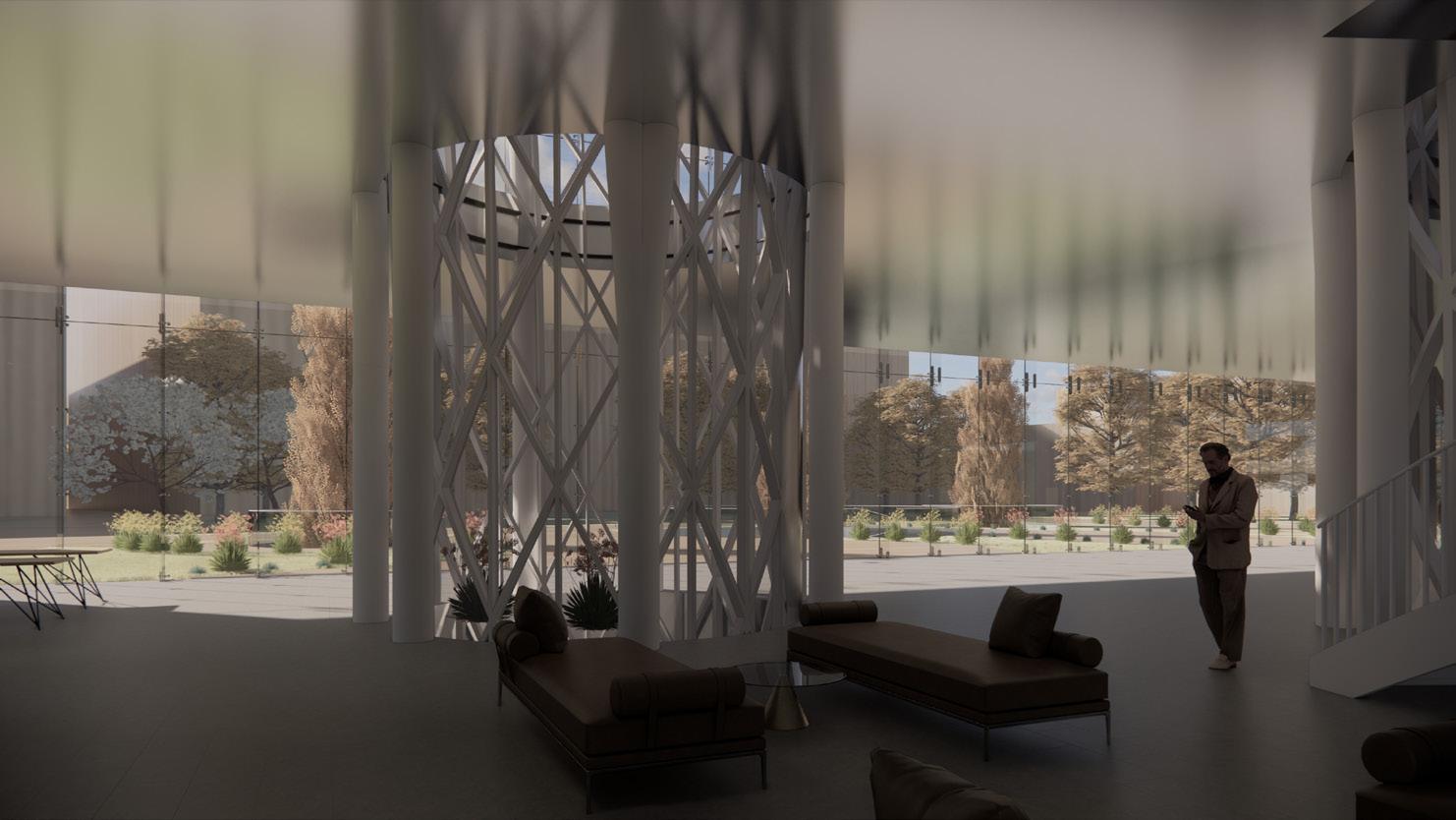 La “Foresta” delle colonne massicce di progettazione parametrica detta la circolazione all’interno dell’edificio fornendo al contempo fonti di luce e ventilazione in quanto sono utilizzate come corti interne, accessibili dal piano interrato dell’edificio, dove si concentrano le attività di ricerca.
