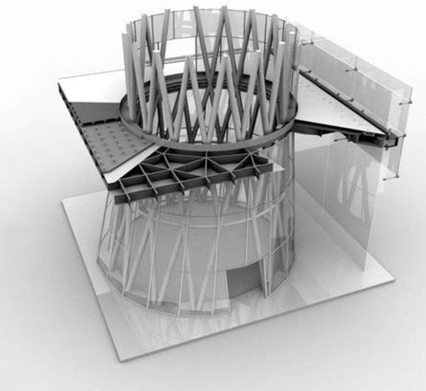 The “Forest” of massive parametric design columns dictate the circulation within the building while providing sources of light and ventilation as they are used as inner courtyards, accessible from the building’s underground floor, where the research activities are concentrated. In front of the main façade of the museum, directly from the park, the main path introduces into this “inhabited terrain”, the innovation and research environment, through the main ramp which penetrates in a stenographic way into the hypophyseal level.