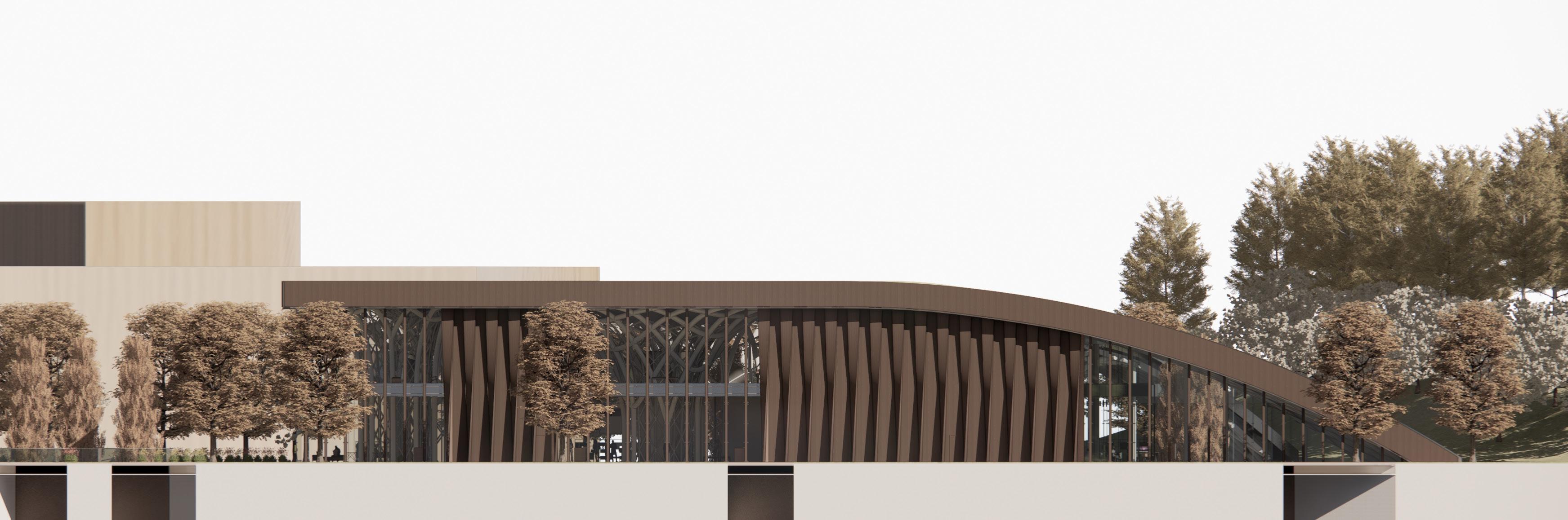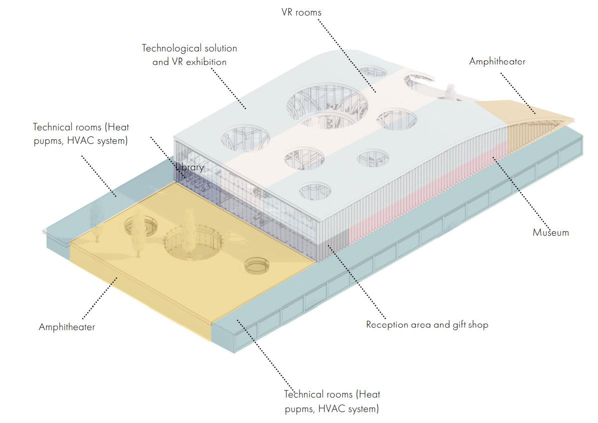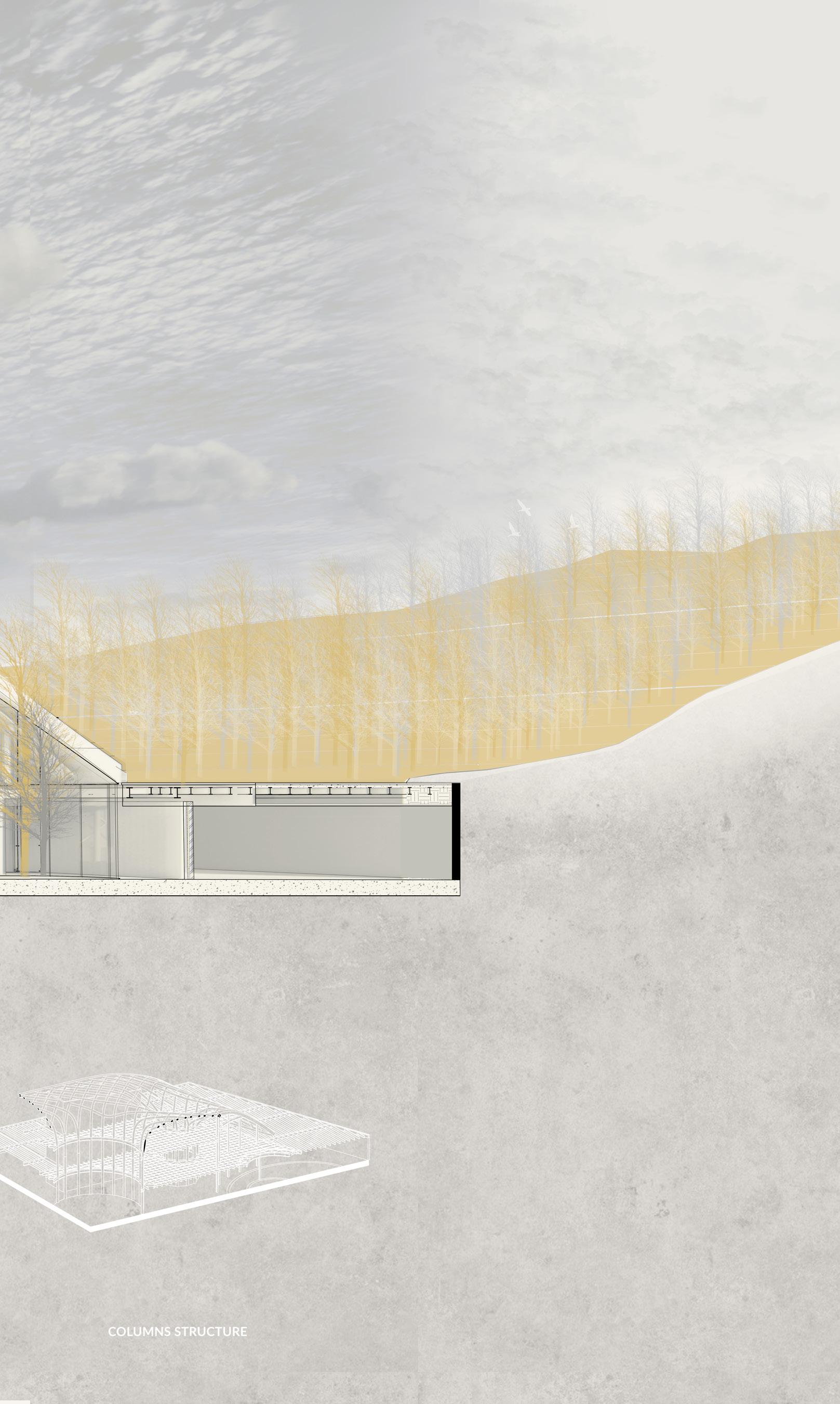 and the hill it is facing, the east façade is designed as a glazed elliptic opening, revealing the view of the hill from the east. The Opposite view, from the hill itself, Reveals instead a set of tree-like columns, supporting a curved green roof, ideal continuation of the park.