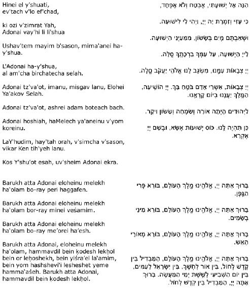 Y’ru et-Adonai k’doshav ki ein machsor lirei-av. K’firim rashu v’ra-eivu v’dorshei Adonai lo yach-s’ru chol-tov. Hodu LAdonai ki tov, ki l’olam chasdo. Potei-ach et-yadecha u-masbia l’chol-chai ratzon. Baruch ha’gever asher yivtach b’Adonai, v’haya Adonai miv’tacho. Na-ar hayiti gam zakanti, v’lo ra’iti tzadik neezav v’zar-o m’vakesh-lachem.