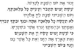 Zachor es yom ha-Shabbos le-kadesho. Sheishes yamim ta’avod ve-asisa kol melach’techa. Ve-yom ha-shevi’i Shabbos la’Adonoy Elohecha, lo ta’aseh chol melacha ata u-vincha u-vitecha avdecha va-amasecha vehem’techa ve-geirecha asher bi-she’arecha. Ki sheishes yamim asa Adonoy es hashamayim ve-es ha-aretz es ha-yam ve-es kol asher bam, va-yanach bayom ha-shevi’i.