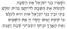 Ve-shameru venei Yisrael es ha-Shabbos, la’asos es ha-Shabbos le-doro’sam bris olam. Beini u-vein benei Yisrael os hee le-olam, ki sheishes yamim asa Adonoy es ha-shamayim ve-es ha-aretz uva-yom ha-shevi’i shavas va-yinafash.