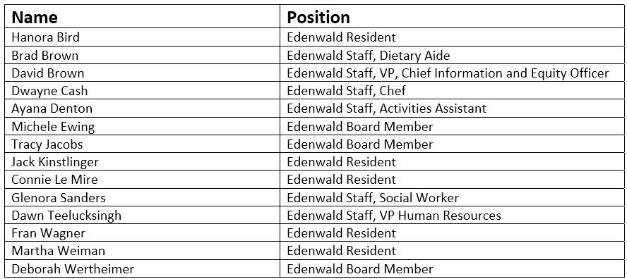 Edenwald’s Diversity, Equity, Inclusion and Belonging (DEIB) initiative sprang from the June 30, 2022, DEIB Retreat attended by Board members, Edenwald staff, and more than a dozen residents. The opportunity for residents’ participation at the Retreat was, in turn, followed by including five resident representatives on the DEIB Committee. The Residents’ Association appreciates the Board’s and Administration’s commitment to including resident participation on the DEIB Committee.