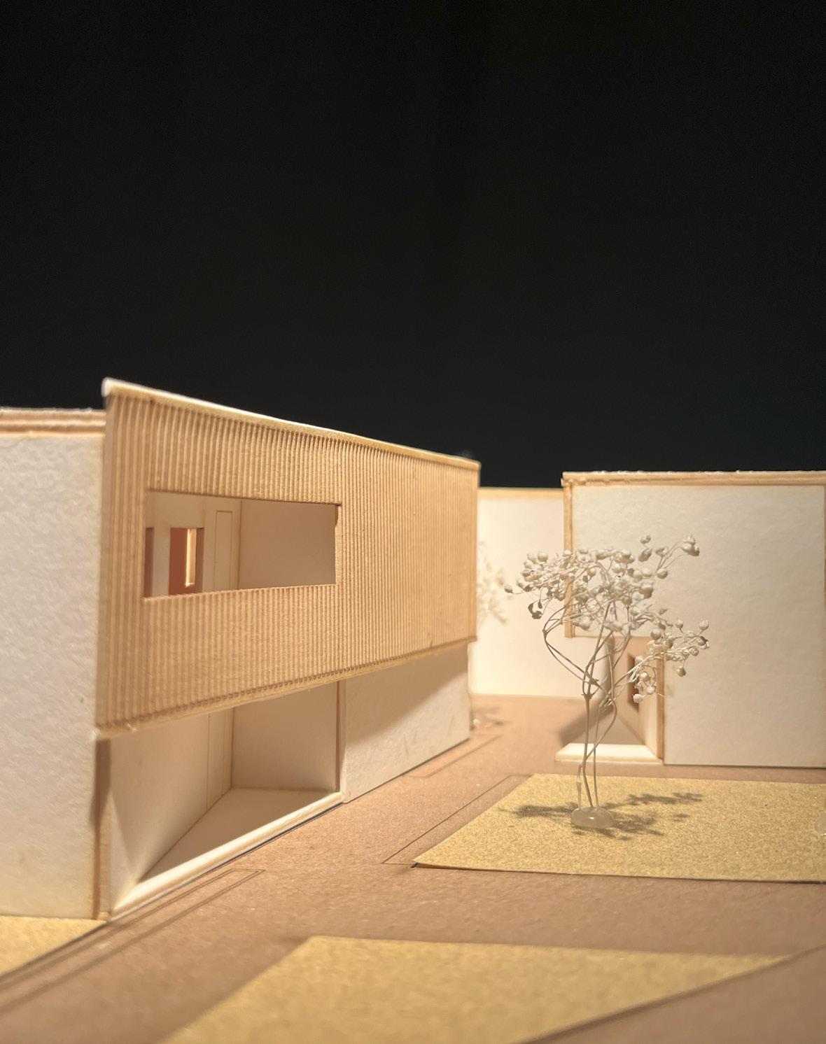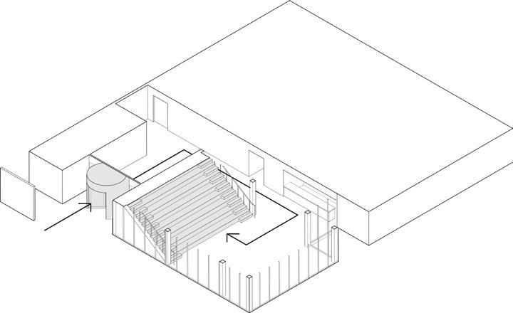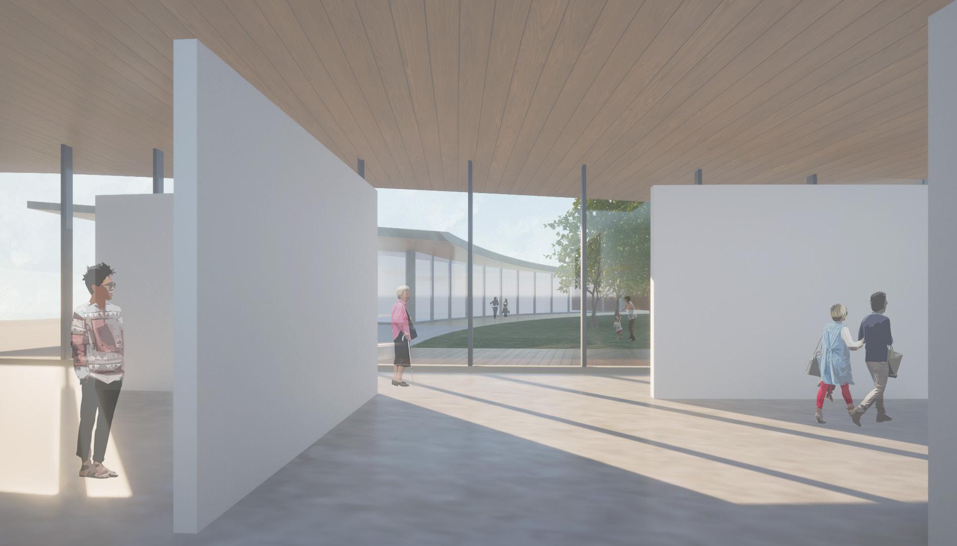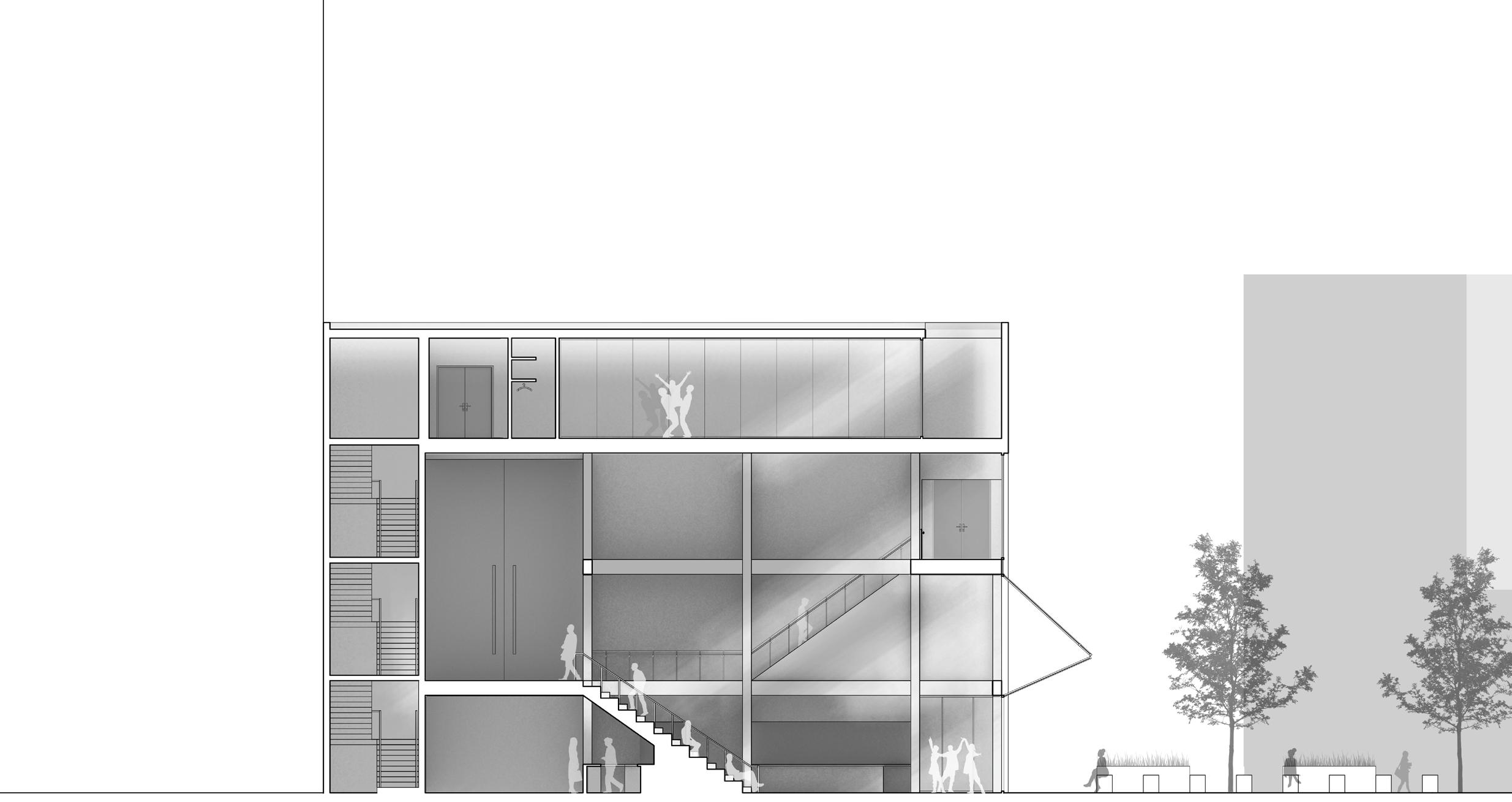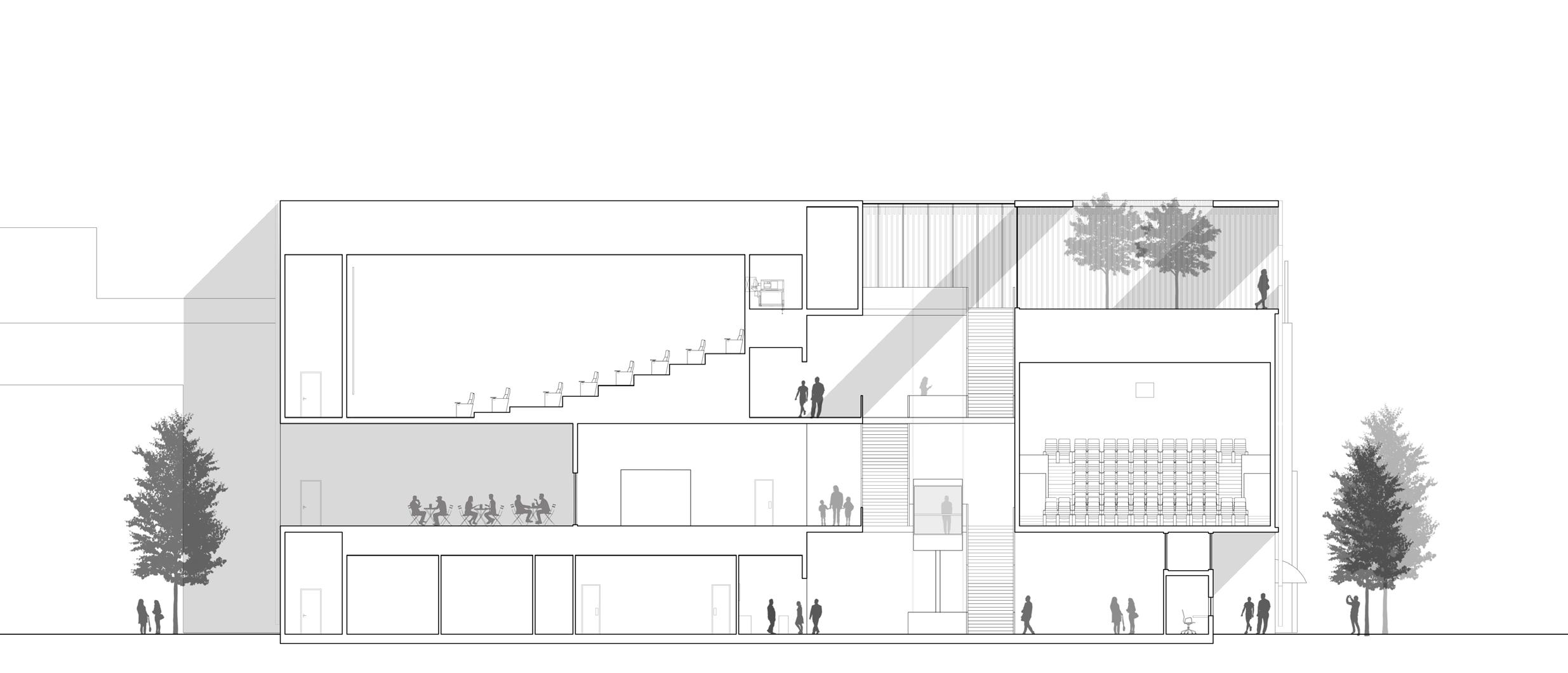 The strategic positioning of the black box theater, perpendicular to the white box with large double height doors, facilitates a fluid transition between spaces, enhanced by expansive doors connecting the two realms.