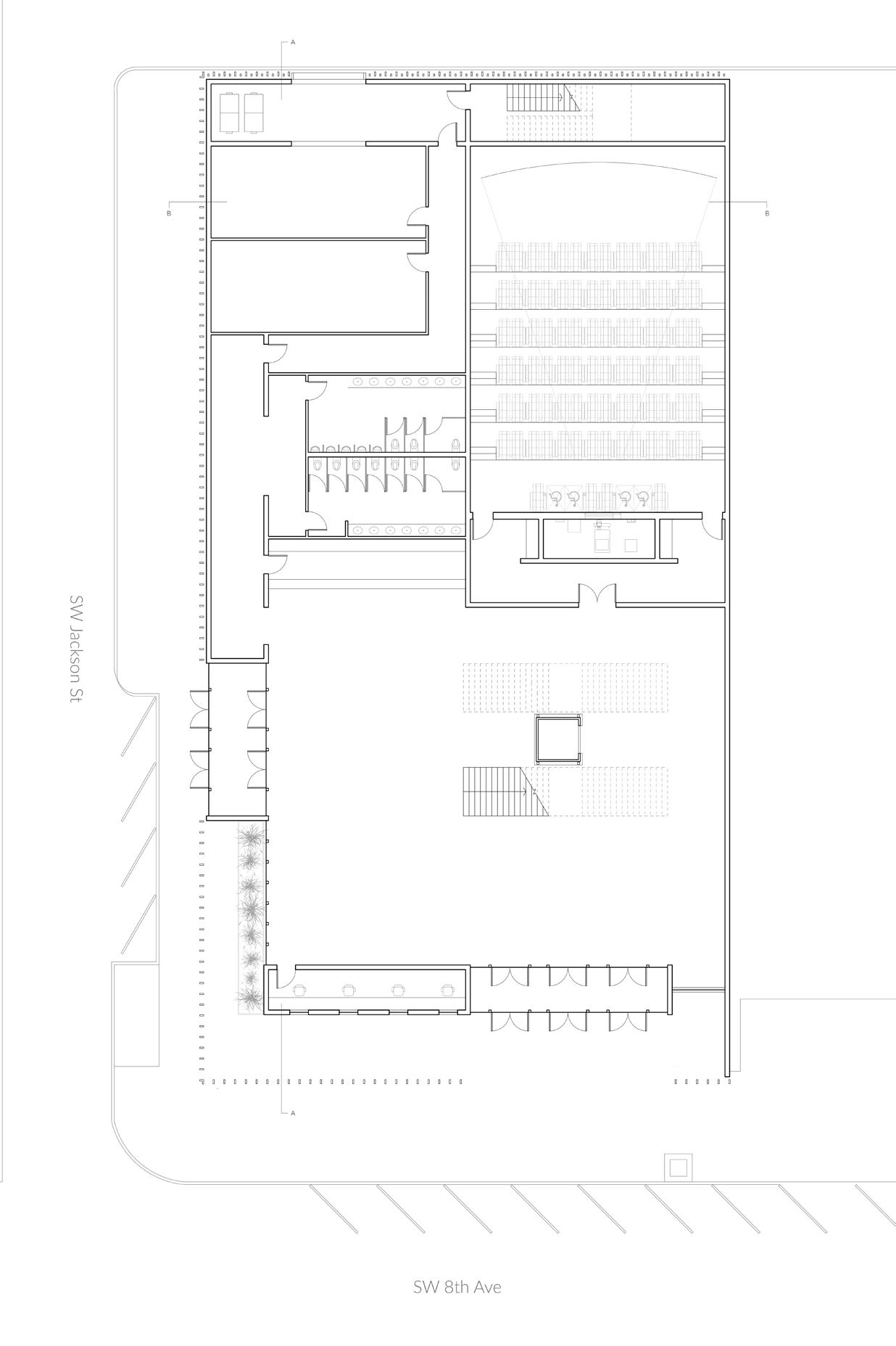 The arrival of the Aztek Theater in downtown Topeka is an opportunity to promote engagement in the urban setting. Prioritizing visual engagement from the sidewalk, strategically revealing spaces where people naturally gather, captivate the passerby.