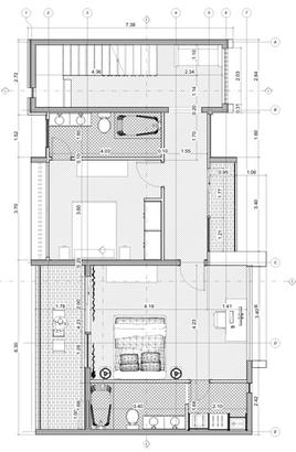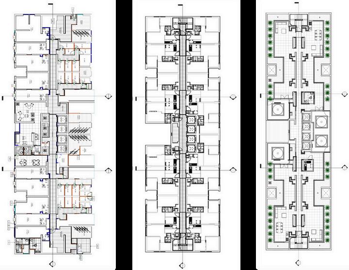 The first floor of the building features four types of commercial spaces, totalingtenretailunits,andincludes20 rooms designated for storage and administration purposes. Additionally, there are three technical rooms and fourbicycleparkingspaces.Floorsthree through eight share the same apartment layout, ensuring uniformity andefficientuseofspace.Therooftopis designed to be accessible, offering two BBQ areas and landscaped gardens, providing residents with recreational andsocialamenities.