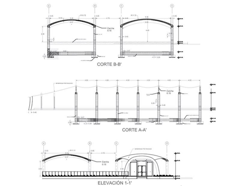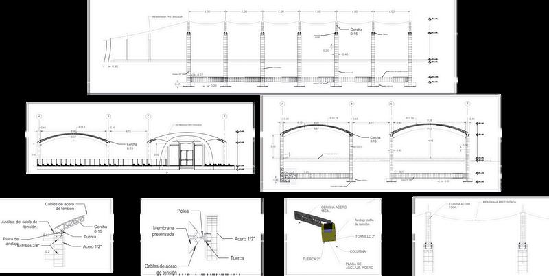 The pavilion is a project presented for an architecture competitioninthecityofCali,itislocatedonacornerlotat theintersectionofCra4NandCll62N.Forlandplanningof a tensile structure of 878 square meters. This structure consists of two parallel sections, each supported by structural trusses strategically placed at 4 meter intervals. The roofing system involves a non-structural membrane anchored to columns through a sophisticated pulley mechanism,ensuringstabilityandaestheticappeal.