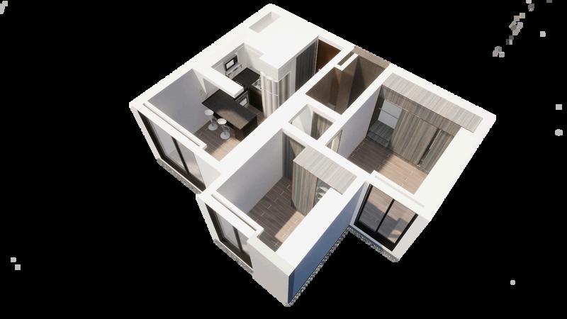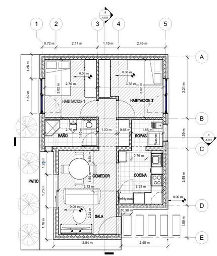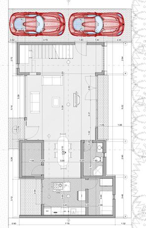 TheAxisHouseisasingle-familyhomeof50m²,laidouton a single floor. It features a double-height gable roof. The interior space consists of two bedrooms, one bathroom, a living-dining room, and an American-style kitchen. Additionally, it includes a laundry room and a backyard withagarden.