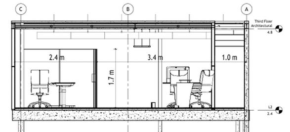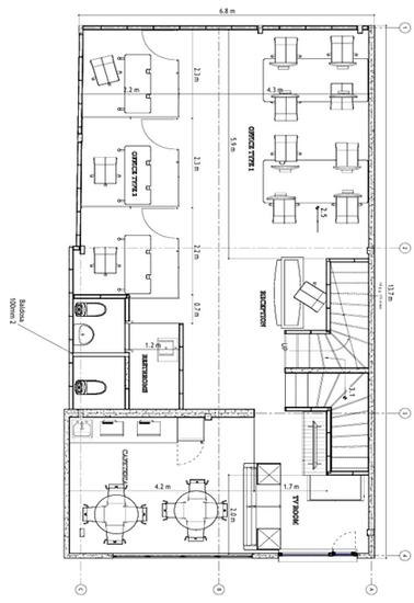 The office is situated on the second floor, characterized by a well-defined floor plan that delineates the spatial arrangement. The office features partitions constructed from drywall, offering flexible division of areas, while a robust steel frame system supports the ceiling, ensuring structural integrity and allowing for versatile design possibilities.