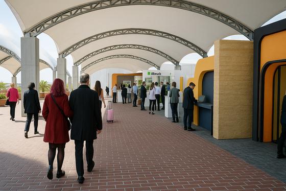 The tensioned membrane, supported by structural trusses, protectsvisitorsfromtheelements,blendingfunctionalitywith aestheticappeal.