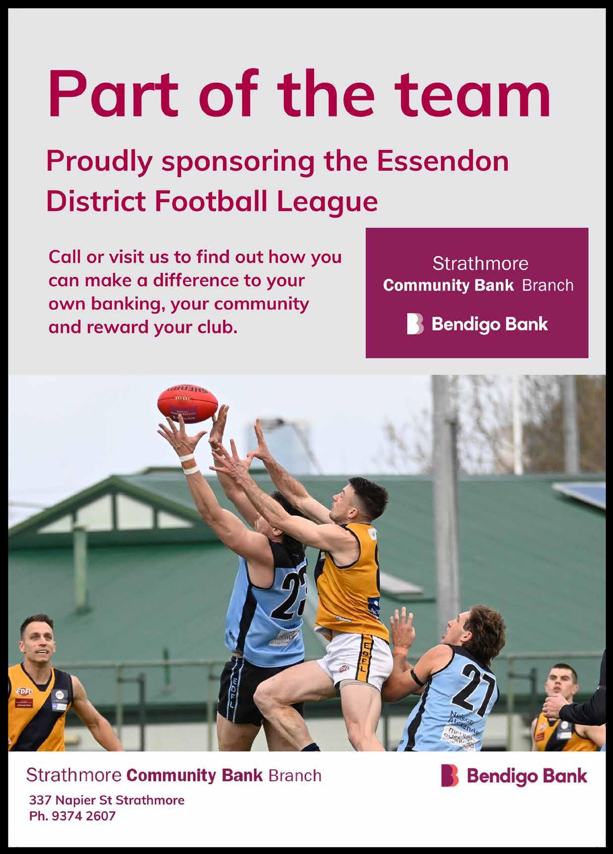 editorial and photographs are prepared by the Essendon District Football League Media Manager including articles and those contributors, published in the Essendon District Football League official record The Footballer, are subject to copyright laws and cannot be reproduced without the permission of the Essendon District Football League. Action photos courtesy of Shaun Sharp (Moments by Shaun)