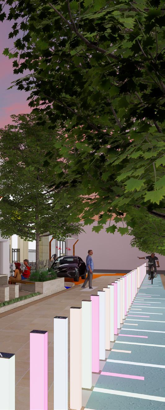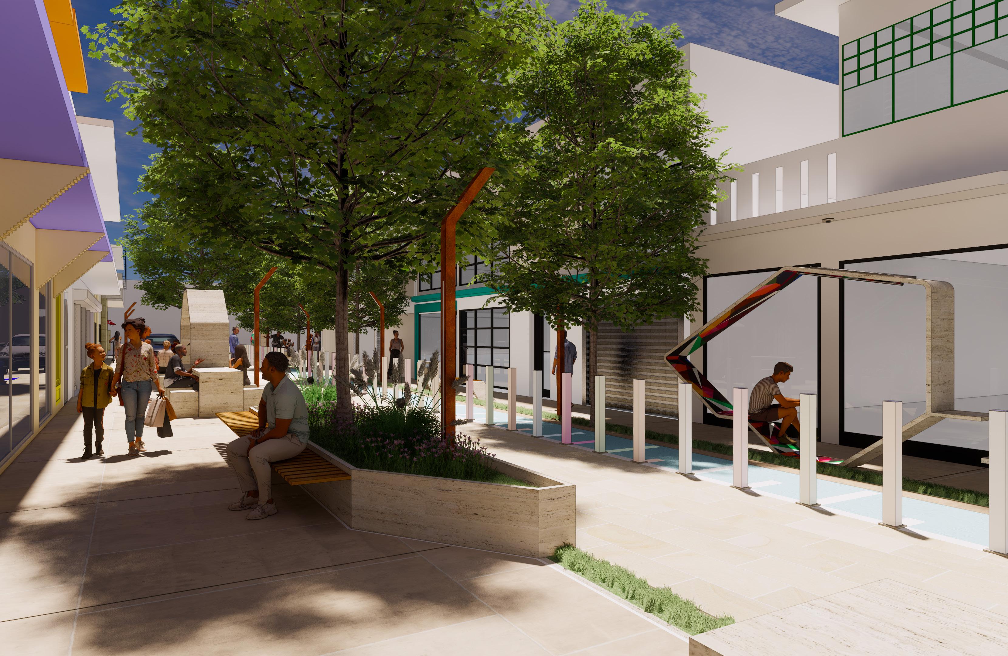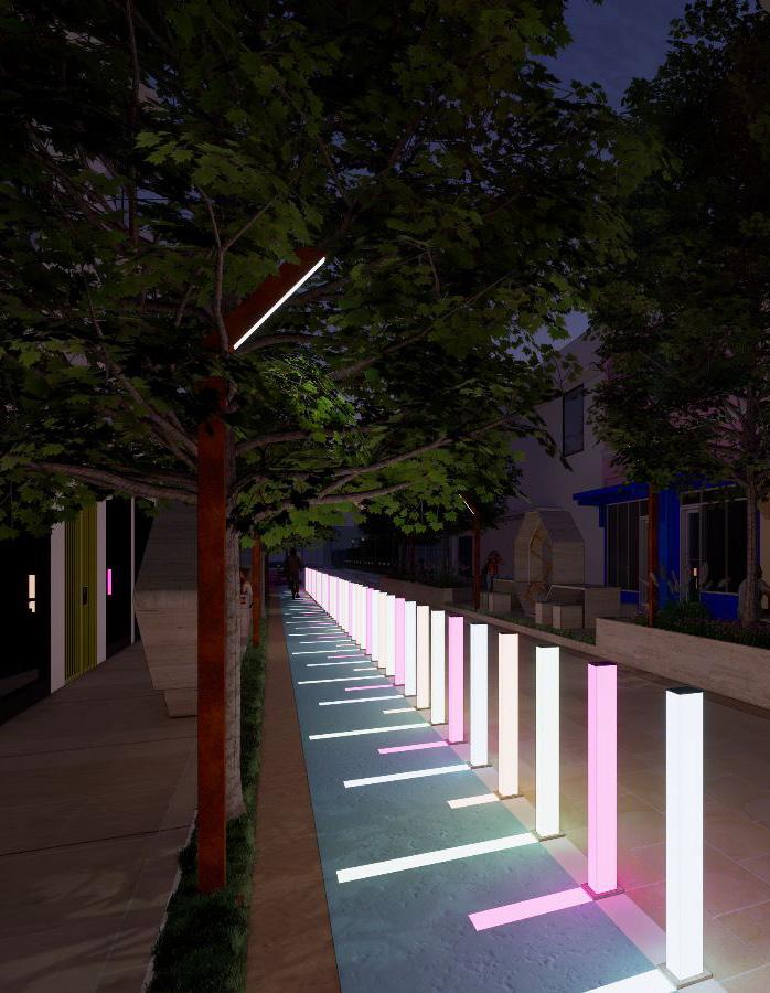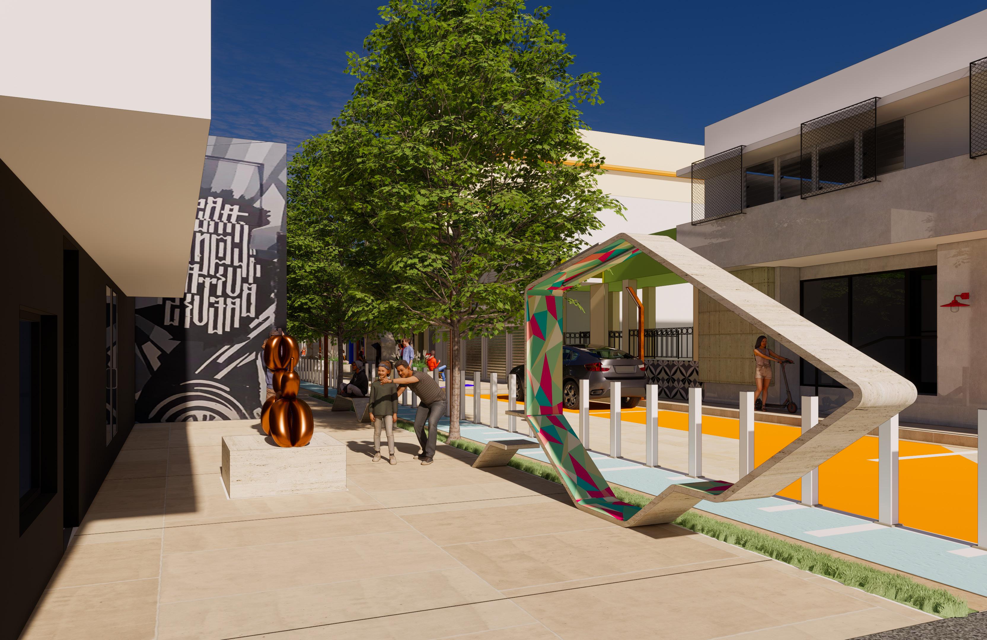 The proposal suggests a district that treats the city and its surroundings as an interactive and sequential canvas, allowing both artists and users to appropriate and experience the space according to their needs. The sidewalk and furniture are designed with a monolithic language and a palette of neutral colors that suggest serenity and spatial expansiveness, highlighting the art in the area. On the other hand, an interactive lighting system was designed, inspired by urban music and the existing murals in the area, to provide the user with the opportunity to become an artist.