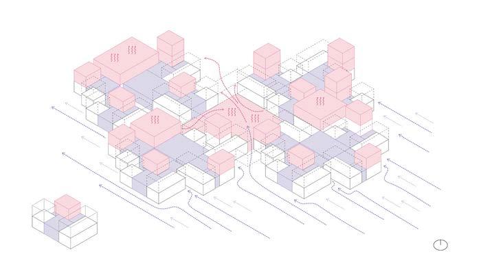 The project in Madrid focuses on transforming the Centro de Cálculo de la Caja Postal, designed by Alejandro de la Sota in the 1970s, into a residential space that embodies coexistence. By promoting protective isolation from challenges like climate change and insecurity, it creates an environment where humans and non-humans can thrive together. This layered system integrates circulation, services, and communal areas while fostering both ground-level and underground biodiversity, advocating for an inclusive and sustainable urban ecosystem.