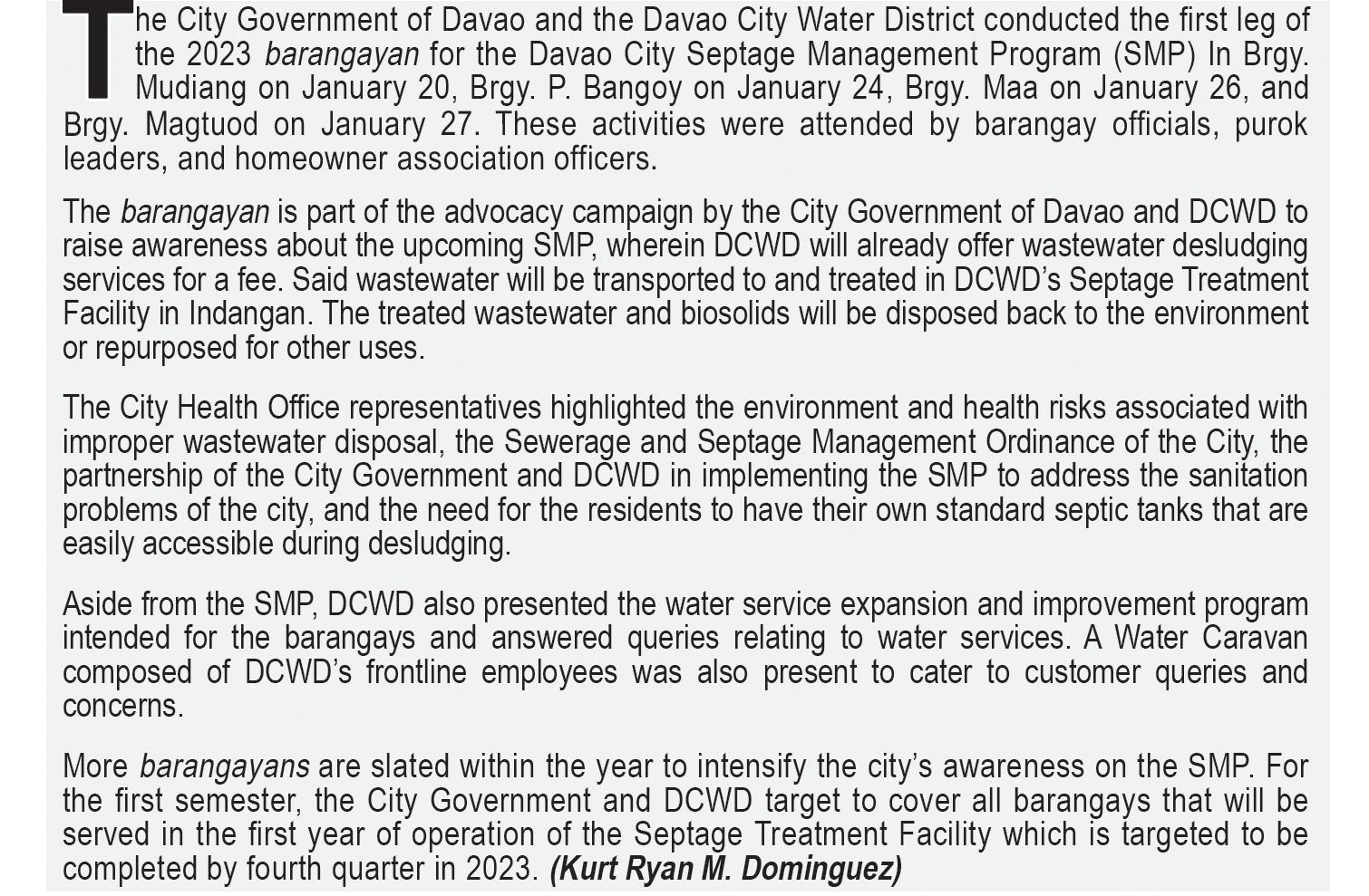 Hall of Jehovah’s Witnesses, and neighboring areas. Customers along Mandug Road from Buhangin Central Elementary School to DMMA, and neighboring areas; as well as those along Daang Maharlika Highway from Crossing Mamay Road to Orange Grove Hotel and neighboring areas will FSERVICE, P6