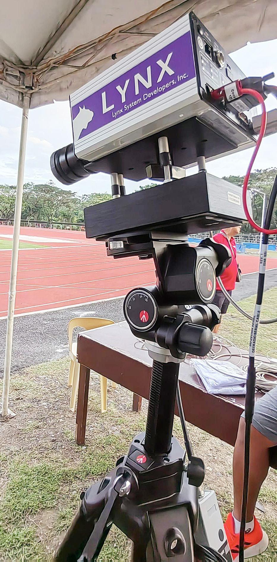 Philippine Athletics Track and Field Association (PATAFA) National Executive Vice President and UM President Willie Torres Jr using the new Lynx Track timing system at the UM Track oval which was used during the 3rd GET Invitational Track Competitions last March 4.