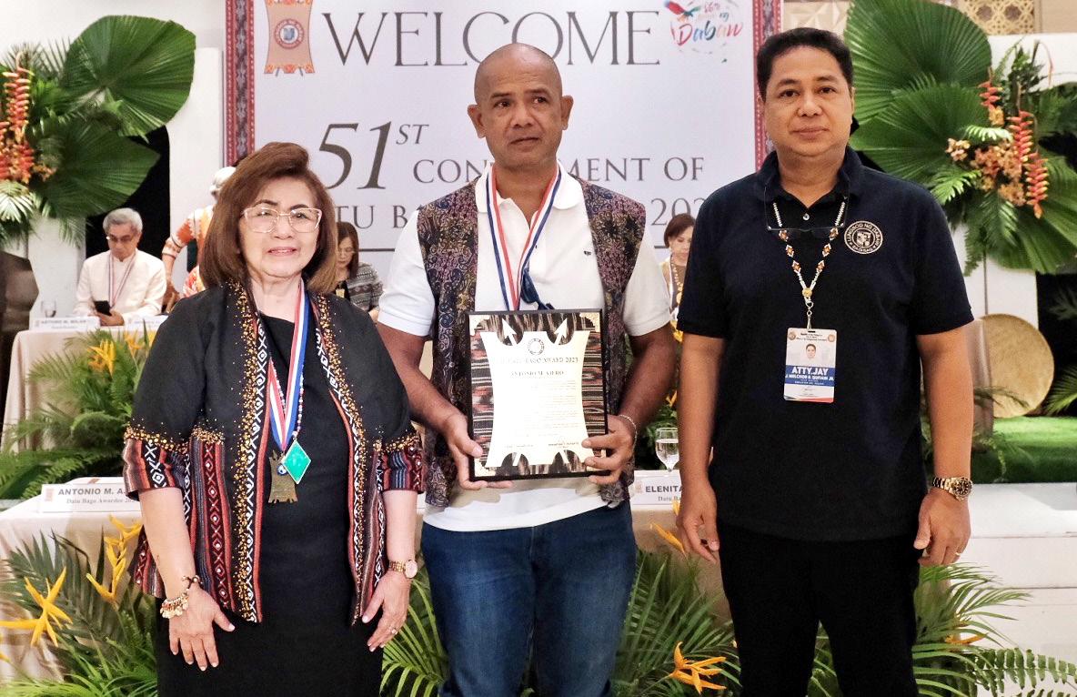 Anthony Ajero Jr. receives the Datu Bago award for his father, the late Antonio M. Ajero, from Datu Bago Awardees Organization, Inc. chair Councilor Pilar Braga and Vice Mayor J. Melchor Quitain Jr. during the 51st Conferment of Datu Bago Awards 2023 held at The Royal Mandaya Hotel in Davao City on Wednesday. Lean Daval Jr.