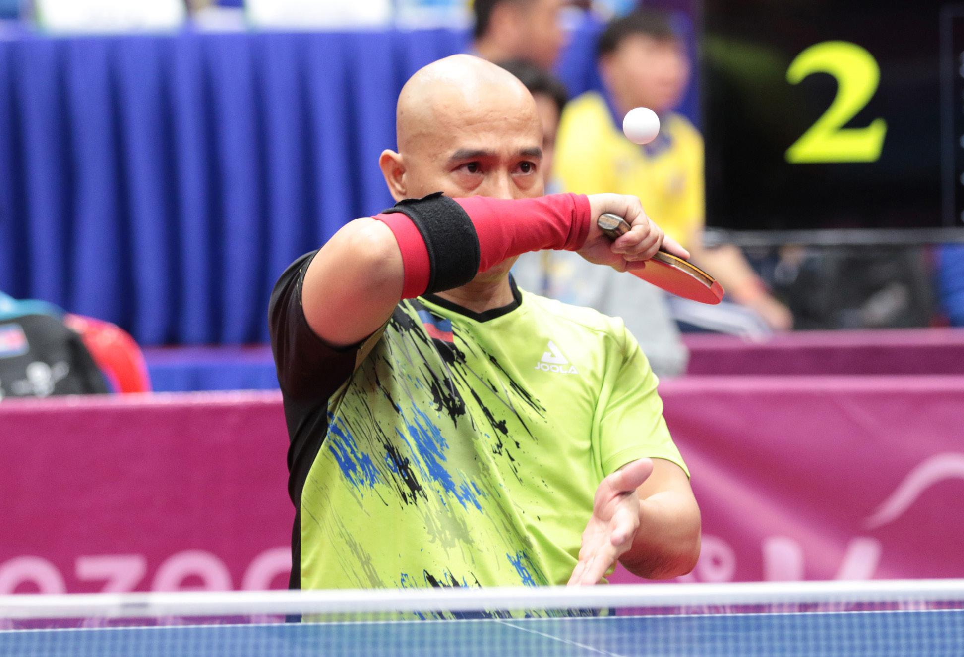 Billy Smith Cartera of the Philippines competes against Adyos Astan of Indonesia in Para table tennis men class 4 at Morodok table tennis hall, 12 Asean Para Games Phnom Penh Cambodia on June 7 2023.