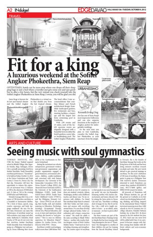 Seeing music with soul gymnastics TubuRAN INSTITuTe, INC. (TbI) the Steiner Waldorf inspired school in blissful Village, Sitio Sagrada Familia, brgy. Indangan, Davao City is proudly presenting ArteNova Institut eurythmy Youth ensemble’s eurythmy performance, “Transitions” to be held on Friday, October 12, 2012 at the Davao Convention and Trade Center, F. Torres St., Davao City. On that day, Davaoeños will have the opportunity to witness this expressive art movement twice 1) Matinee at 3:00 in the afternoon (P100/ticket) and, 2) Gala at 7:00 in the evening (P200/ticket and P400/ticket). Moniela Gonzaga dela Cruz, a volunteer of TbI describes eurythmy as a beautiful or harmonious rhythm. “It’s a form of dance, speech, song, creative expression and body language combined,” she says. For the first time, Davaoenos can enjoy this performance of eurythmy jazzed up with acrobatics, jazz, tango, and other styles. Katherine e. estember, head Teacher of Tb says it’s not every day that ArteNova Institut eurythmy Youth ensemble from Switzerland is going on a Philippine tour and passing by Davao following their recent