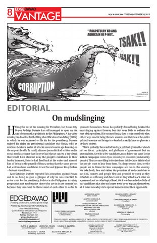 promote themselves. Roxas has publicly denied being behind the mudslinging against Duterte, but that does little to address the root of the problem. If it was not Roxas, then it was somebody else; either way, mud is being thrown around, and it debases the entire political exercise and brings it to levels that really have no place in a civilized society. This is probably the result of having a political system that stands not on ideas, principles, and platforms of government but on personalities. Save for a few candidates, most follow the same script in their campaigns: maka-Diyos, makabayan, makatao (God,country, people). They are unwilling to deviate from this because this is what the people want to hear from them. To a large extent, then, we the people are to blame for how campaigns are run in this country. We take hook, line and sinker the promises of each candidate to put God, country, and people first and proceed to watch as they entertain us with song and dance and as they attack each other on a personal and not ideological level. We have demanded so little of our candidates that they no longer even try to explain themselves; all it takes nowadays is to spread rumors about their opponents. ANTONIO M. AJERO Editor in Chief