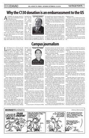 editorial writ- THINK ON THESE! ing (pagsulat ng pangulong tudling), feature writing (pagsulat ng lathalain), sports writing (pagsulat ng balitang pamp a l a k a s a n ) , Henrylito D. Tacio copyreading henrytacio@gmail.com and headline writing (pagwawasto ng sipi at pag-uulo ng balita), photojournalism (pagkuha ng larawang pampahayagan) and science and health writing (pagsulat ng balitang agham at kalusugan). The group competitions include radio broadcasting and script writing (ulat panradyo at pagsulat ng iskrip), television broadcasting and script writing (ulat pantelebisyon at pagsulat ng iskrip), and collaborative desktop publishing. Just a little bit of history of NSPC. According to Wikipedia, the Public Secondary Schools Press Association (PSSPA) – as it was then known – had its first convention in what was then Pasig, Rizal in November 1931. It was Ricardo Castro who founded the PSSPA, which had 17 original member schools. “During this first convention,” Wikipedia reported, “writing competitions for the different sections of a school paper were held. The tradition continued year after year, as the number of member-schools increased, with different parts of Luzon as venues. After World War II, the PSSPA was reorganized and 49 member-schools participated in the National Convention held in Manila.” It was not until in 1955 that the PSSPA